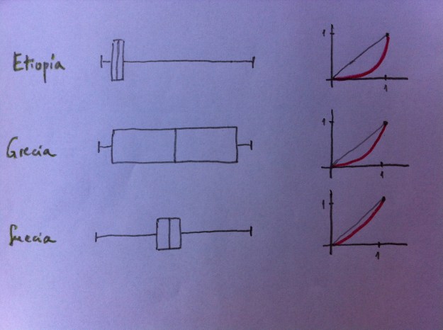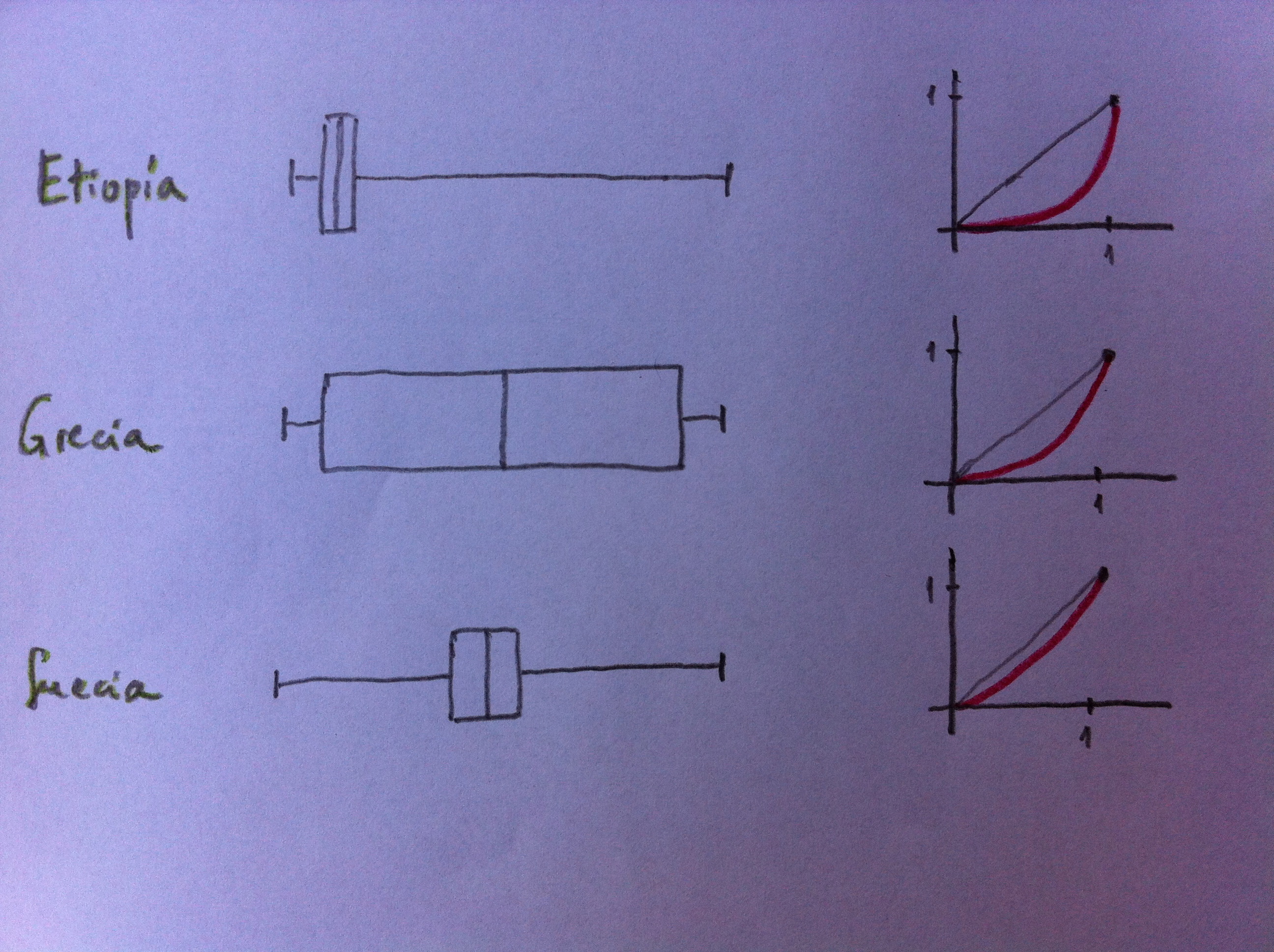 La solución es la que se ve en el esquema adjunto. Se añade también, ahora, una curva de Lorenz hipotética de cada país. El reparto de la riqueza es bien distinto en cada uno de estos tres países. Más igualitario Suecia y muy desigual Etiopía. Grecia está en una posición intermedia. Es importante ver cómo el Box-Plot y la curva de Lorenz, cada uno a su manera, dibuja esta distinta distribución de la riqueza que hay en los tres países: