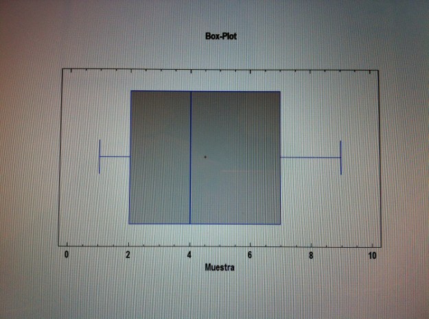 72. Los dos extremos del gráfico captan el mínimo (en nuestra muestra: 1) y el máximo (en nuestra muestra: 9) de la muestra. Su resta es el rango (8, en esta muestra). La caja dibujada en el interior empieza en el percentil 25 (en este caso: 2) y acaba en el percentil 75 (en la muestra que nos ocupa: 7). La diferencia entre estos dos valores es el rango intercuartílico (5, en nuestro caso). La línea interior en la caja es la mediana (4, en nuestra muestra). Y el puntito dibujado y resaltado marca la media muestral (en esta muestra es 4.5).