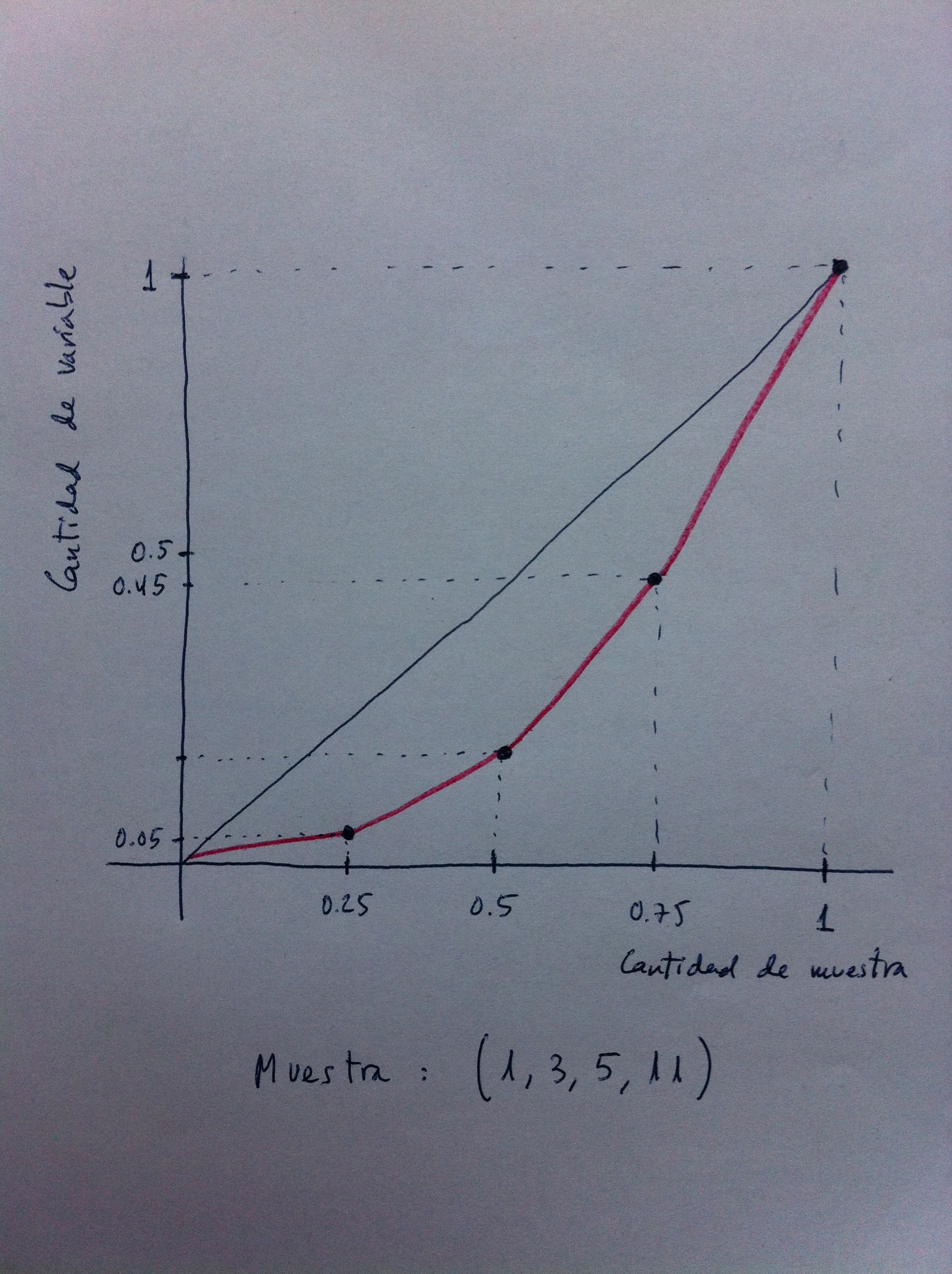 79. En el eje de las ordenadas iremos registrando en lugar del tanto por uno de la cantidad de elementos de la muestra, la cantidad acumulada de valor de la variable estudiada. Vemos que la suma de 1, 3, 5 y 11 es 20. Por lo tanto, cuando tengamos el 25% de los primeros valores muestrales; o sea, cuando hayamos acumulado sólo el primer valor, el 1, tendremos acumulado el 5% (0.05, en tanto por uno) de la suma de valores de la variable, porque habremos sumado sólo ese valor de 1, que representa el 5% del total (1 de 20). Cuando tengamos el 50% de valores muestrales habremos acumulado 1+3=4, en cuanto a valores de la variable, que supone un 20% (el 0.2, en tanto por uno) de la cantidad total de la variable (4 de 20). Cuando tengamos el 75% de valores muestrales habremos acumulado 1+3+5=9, en cuanto a valores de la variable, que supone un 45% (0.45, en tanto por uno) de la cantidad total de la variable (9 de 20). Al llegar al 100% de la muestra evidentemente llegamos al 100% (1, en tanto por uno) del total de la variable, por supuesto.