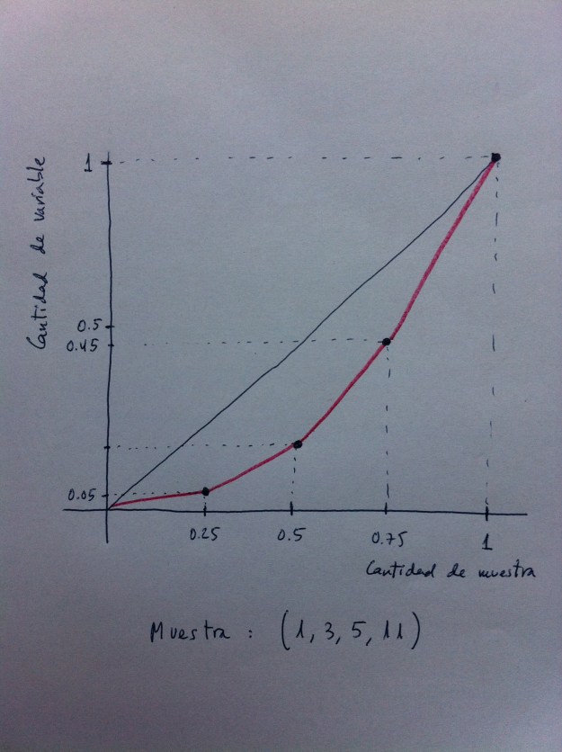 76. Se trata de una forma distinta de analizar la dispersión de una muestra. La curva se dibuja en un gráfico de dos dimensiones: en el eje de las abscisas se dibuja el ritmo del acumulado de la cantidad de valores que hay en la muestra y en el eje de las ordenadas el ritmo del acumulado de valores de la variable de la muestra, ordenada ésta previamente de menor a mayor.