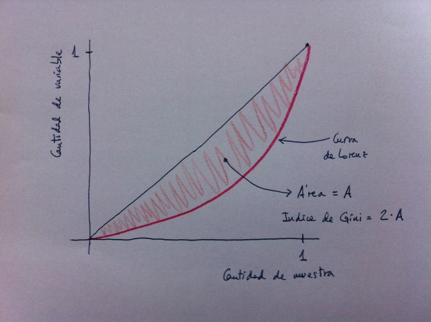 82. Es importante esta curva hipotética porque el área dibujada por esta recta hipotética y la curva de Lorenz de la muestra estudiada, multiplicado por 2, es el famoso Índice de Gini, muy usado en Economía.