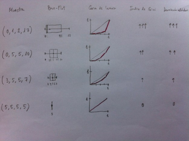 87. Para acabar, un esquema donde se comparan diferentes muestras. Se trata de muestras muy diferentes entre sí, con muy distinta dispersión. Se ve en él cómo estas muestras quedan representadas por gráficos distintos: Box-Plot y Curva de Lorenz y por descriptores también distintos: Índice de Gini y Desviación estándar.