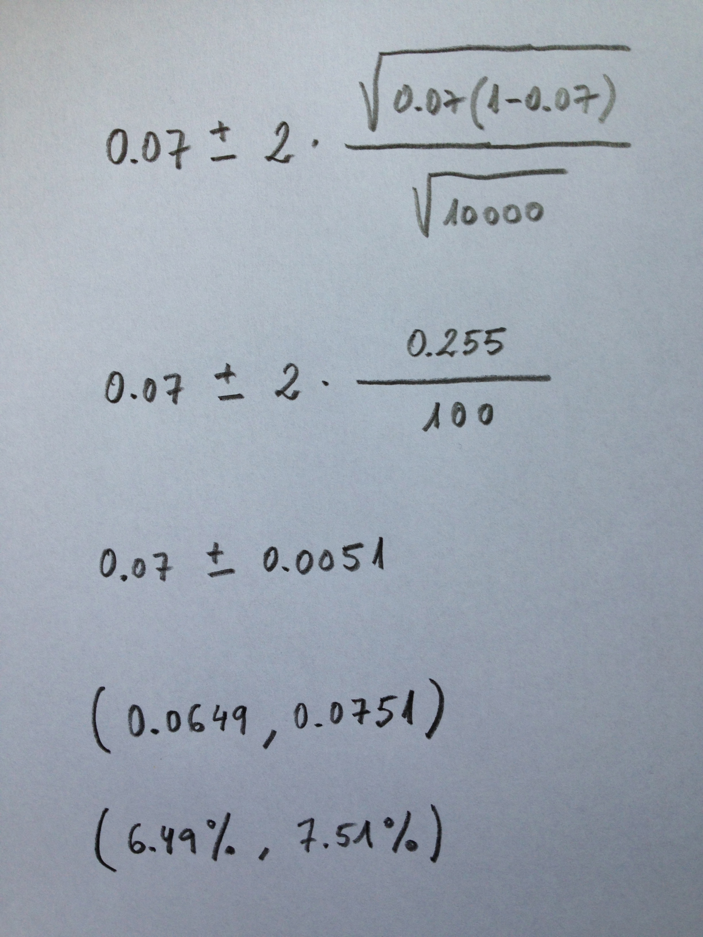 100. Observemos cómo se aplicaría el segundo de estos intervalos. El primero ya lo hemos visto a lo largo de la exposición del tema. Supongamos que hemos hecho un estudio mediante el cual queremos estimar la prevalencia de la diabetes en España. La muestra, supongamos, que es de tamaño 10000 y que 700 tienen diabetes; o sea, un 7% ó un 0.07, hablando en proporciones, en tanto por uno. Si queremos construir un intervalo de confianza del 95% para estimar la proporción poblacional de diabéticos en España aplicaríamos, entonces, la segunda formulación de la siguiente forma: