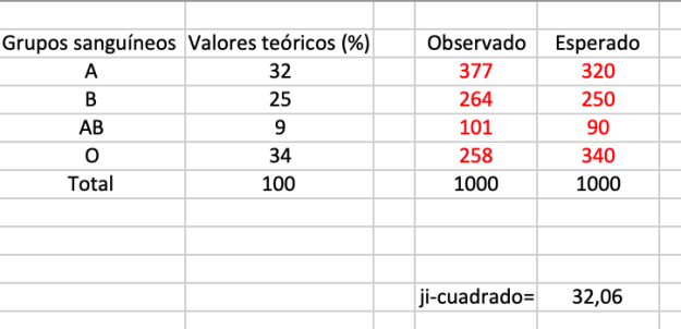 El umbral lo buscaremos en una distribución ji-cuadrado con 3 de valor del parámetro (4 clases menos 1). Si buscamos en la tabla en la sección de COMPLEMENTOS este valor es de 7.81. Por lo tanto, como 32.06 es superior al umbral rechazaríamos la hipótesis nula. Diríamos que no se ajusta a los valores teóricos establecidos.