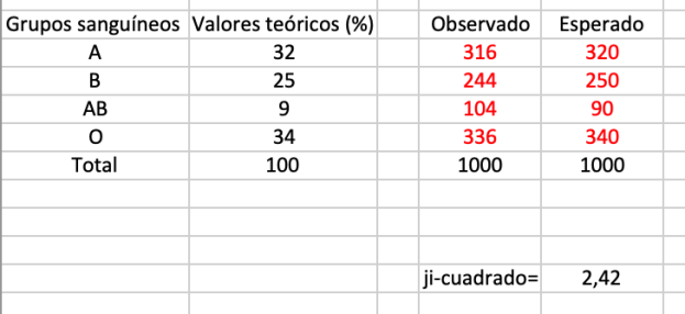 56. Por ejemplo, supongamos que queremos ver si respecto a los grupos sanguíneos A, B, AB y O, en una población los valores muestras encajan con unos valores teóricos prefijados. Se construye una columna de valores observados y otra de valores esperados y se calcula una distancia entre observado y esperado mediante un estadístico de test (el denominado estadístico de la ji-cuadrado), como hemos visto en las tablas de contingencia. El umbral para aceptar o no la hipótesis nula se obtendrá de una distribución ji-cuadrado con un valor del parámetro que será el número de clases menos 1.
