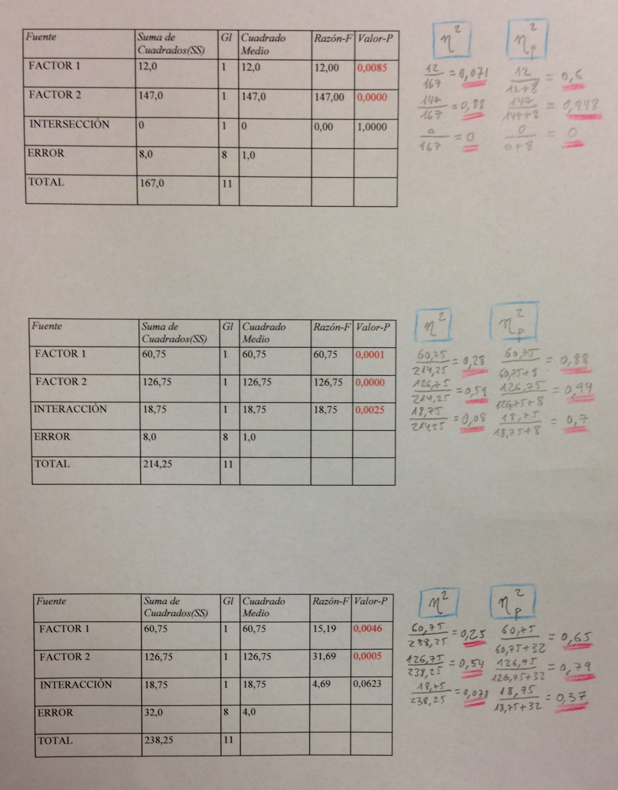 78. Si hacemos los análisis ANOVA de cada tabla y los cálculos de la eta cuadrada y de la eta cuadrada parcial tenemos el siguiente cuadro: