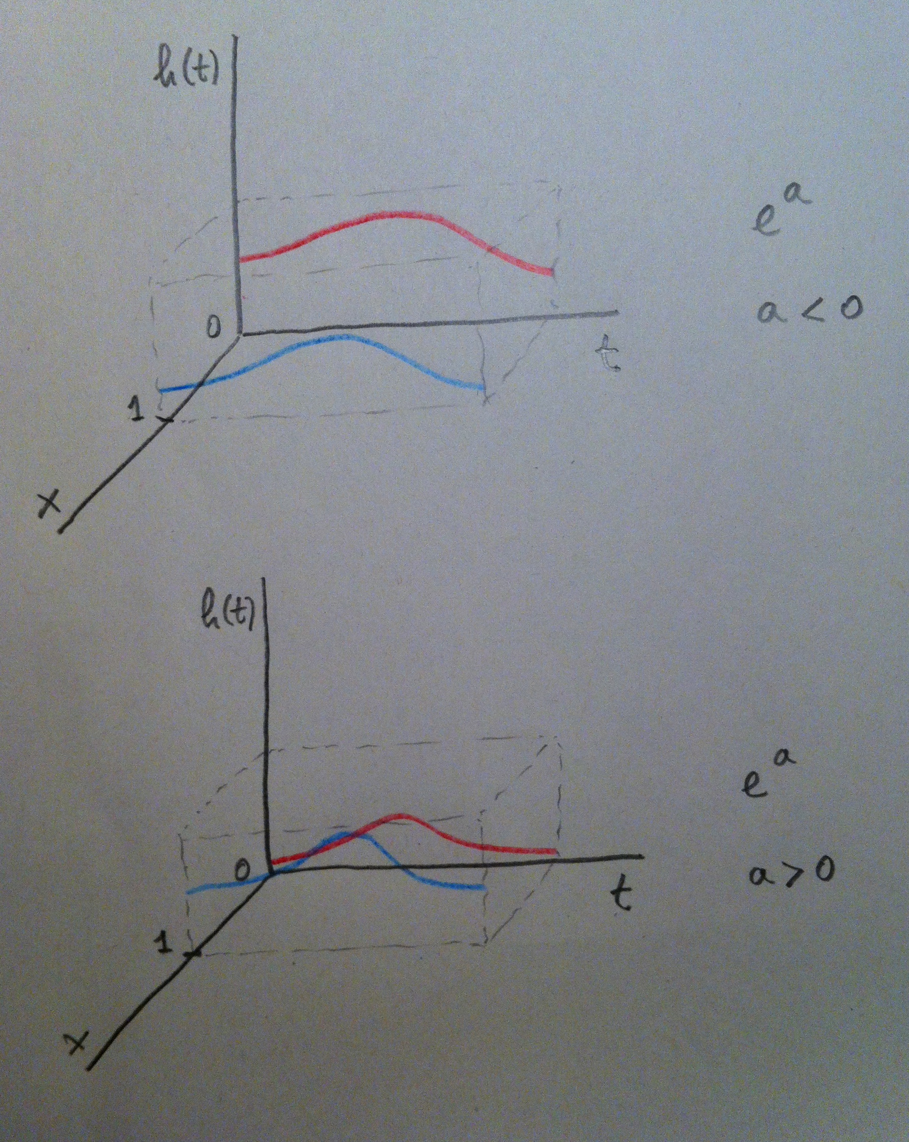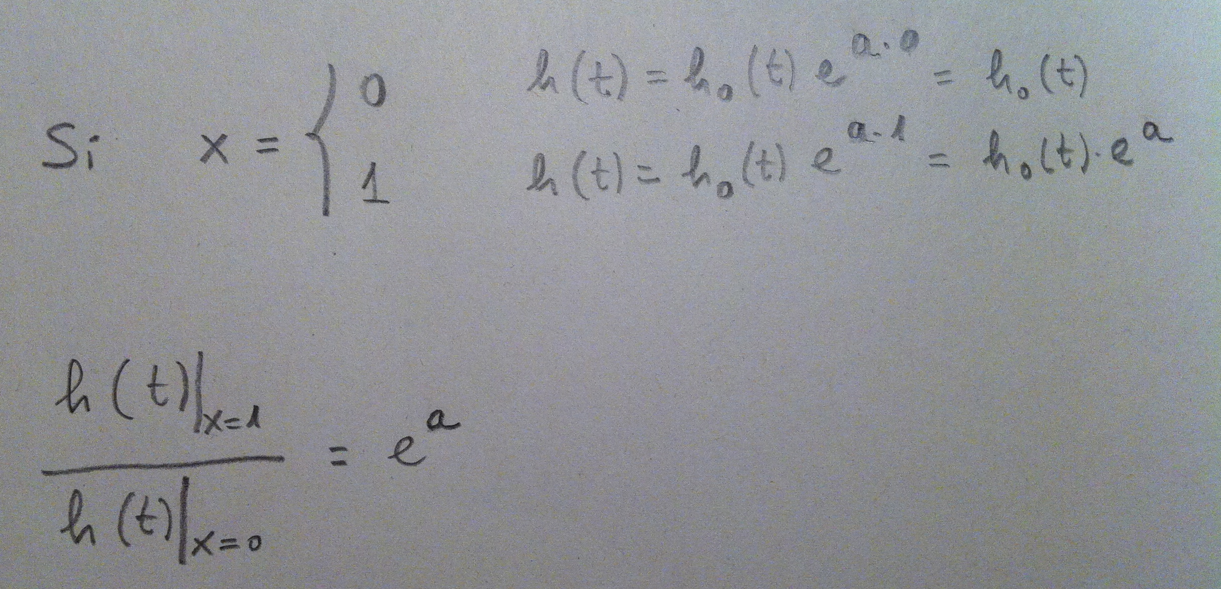 17. La variable independiente tiene así únicamente dos valores (el 0 y el 1). Si aplicamos la fórmula de la Regresión de Cox y luego hacemos el cociente de ambas funciones de riesgo observamos que obtenemos el valor Exp(a). Veamos cómo se entiende, gráficamente, el valor de este coeficiente a: