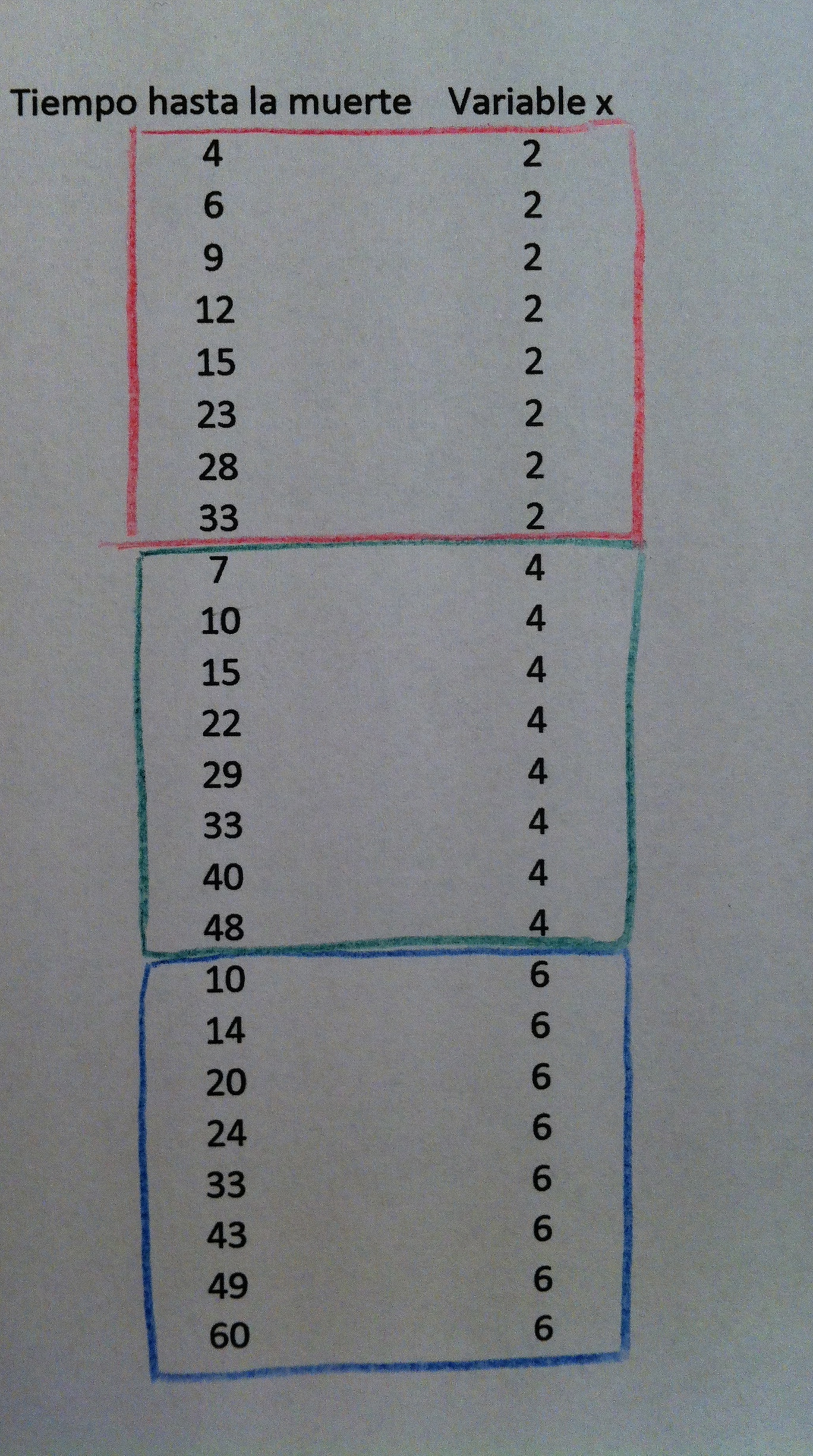 23. Marco con tres colores distintos a los individuos que tienen el valor 2, 4 y 6 de la variable x. Estos valores están ordenados según tengan cada uno de estos tres valores de la variable x y dentro de estos valores están ordenados por tiempos de vida. Se puede ver perfectamente que los individuos con valores mayores de x viven más, hay un progresivo aumento de tiempo de vida al aumentar el valor de x. Claro que hay que viven poco y que viven mucho en los tres grupos, pero los tiempos bajos son más bajos cuando la x es 2 y los tiempos altos son más altos cuando el valor de x es 6.