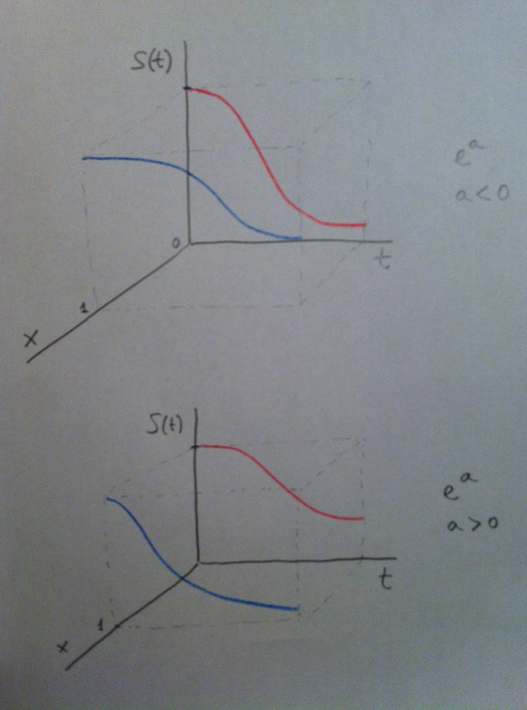 21. Puede observarse perfectamente cómo cambia según la x valga 0 ó 1 la pendiente de la función de supervivencia. En el caso de arriba al pasar de 0 a 1 la supervivencia aumenta. En el caso de abajo al pasar de 0 a 1 la supervivencia disminuye. Contrariamente a lo que sucedía al tratar con la función de riesgo.