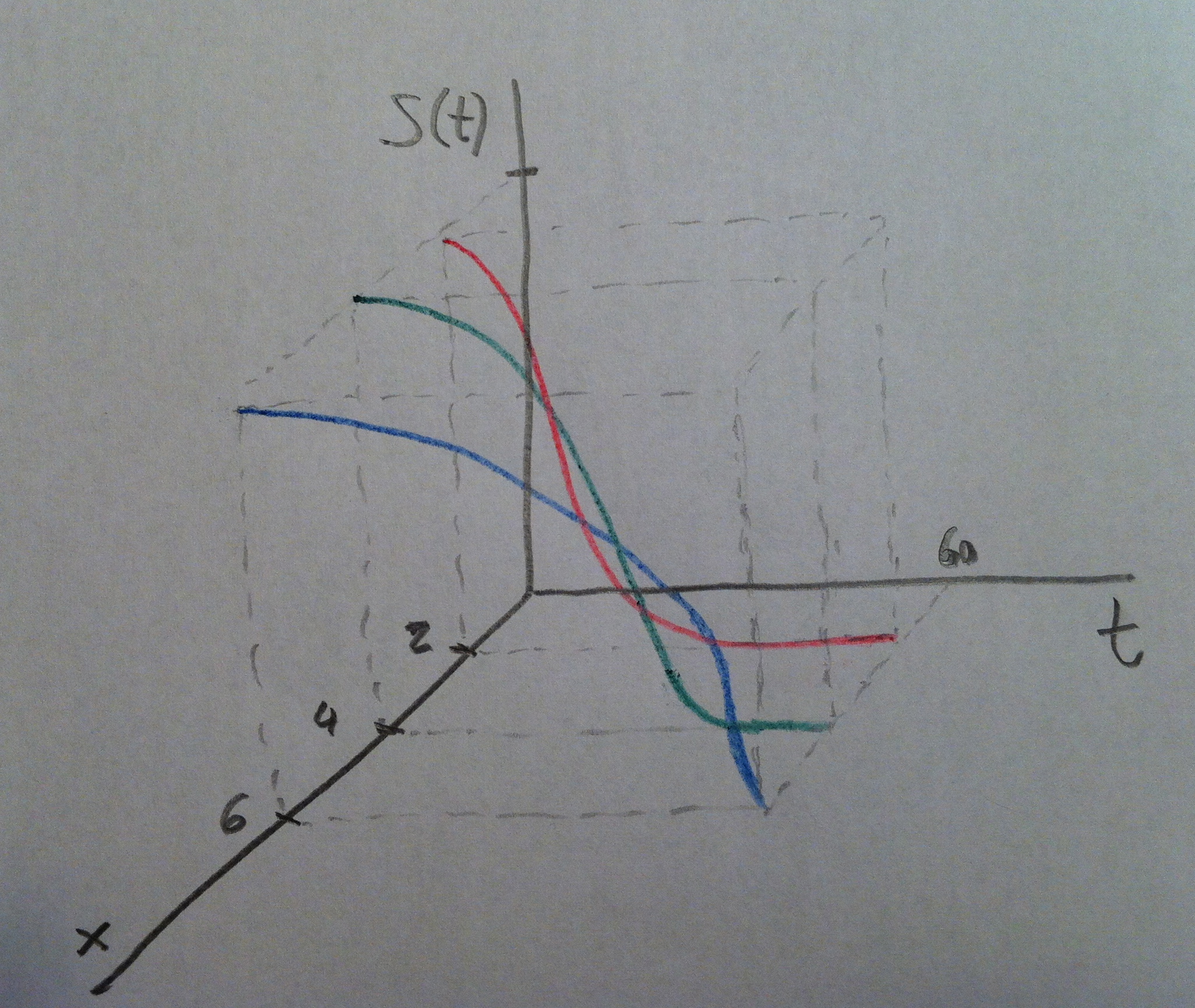 24. Esto se refleja en el gráfico siguiente donde se dibujan las tres curvas de supervivencia en los mismo colores. Se ve que la curva roja refleja una supervivencia menor que la verde y ésta menor que azul. La curva roja cae rápidamente, la verde lo hace más lentamente y la azul tarda más que las otras en caer: