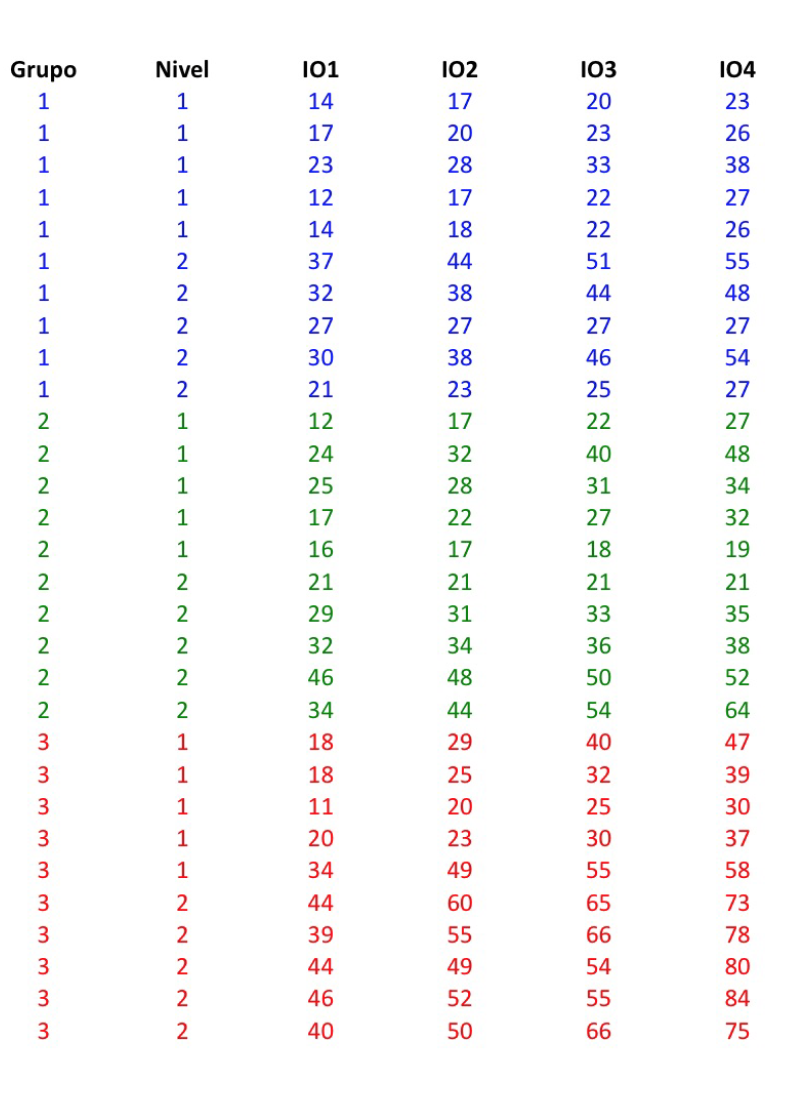 13) Tenemos 30 alumnos que al final de sus estudios de primaria y antes de comenzar la ESO se les hace una prueba homologada de nivel de inglés escrito y de nivel de inglés oral. A continuación se distribuyen en tres grupos en un centro de bachillerato donde se va a realizar un experimento didáctico durante toda la ESO. Los primeros 10 (el grupo 1) van a un grupo Control donde realizarán la formación de inglés clásica en una asignatura anual de inglés cada uno de los cuatro cursos. El grupo 2 se integra en un grupo donde se realizan dos horas más semanales de inglés, pero mediante el método clásico. El grupo 3 se integra en un grupo donde cada año van a tener una asignatura (Biología, Física, Matemáticas, etc.) en inglés. Aunque en el centro son muchos los alumnos distribuidos de esta forma se ha hecho un seguimiento focalizado de estos 30 alumnos. (En realidad, esto se podría hacer con todos los alumnos pero lo supongo así para que el número de datos a manejar sea más pequeño y se pueda apreciar, mirando los datos, lo que las técnicas van mostrando).