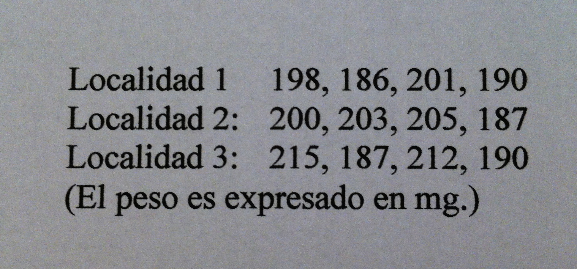 1 bis) Se quiere saber si existen diferencias entre localidades en cuanto al peso del insecto Tribolium castaneum. Se recogen muestras de tres localidades elegidas al azar, entre las muchas donde se encuentra este organismo, obteniéndose los siguientes resultados: