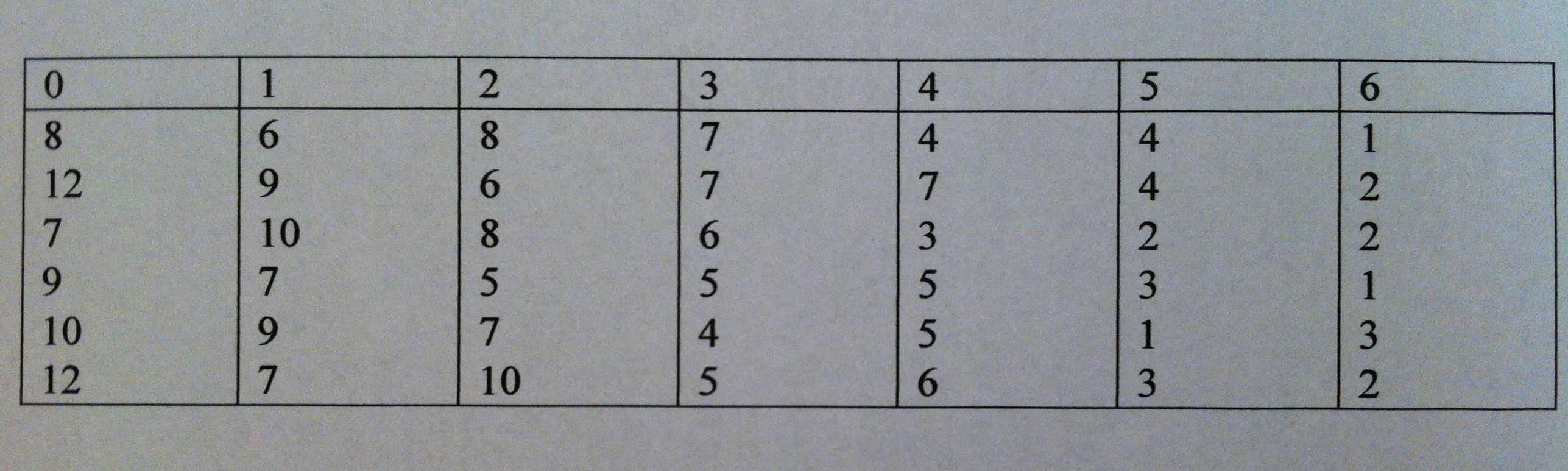 (Cada columna tiene en su cabecera el número de discordancias entre los seis alelos (de 0 a 6), debajo constan el tiempo hasta el rechazo, expresado en años)