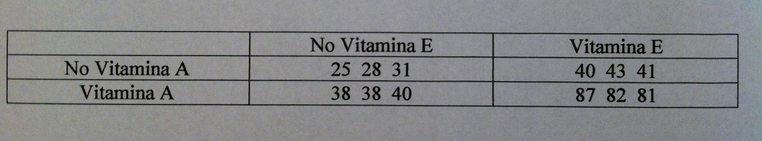 3) Se ha realizado un estudio clínico para ver si las vitaminas A y E mejoran la resistencia de la mucosa ante la afonía. Para ello se han seleccionado 12 profesores con problemas de afonía y con un nivel de resistencia de la mucosa muy similar. Se han distribuido en cuatro grupos. Durante tres meses un grupo tomó placebo, otro sólo vitamina A, otro grupo sólo vitamina E y finalmente el cuarto grupo tomó vitamina A y vitamina E conjuntamente. Se midió un índice de resistencia de la mucosa que va del 0 al 100. Los resultados obtenidos fueron los siguientes: