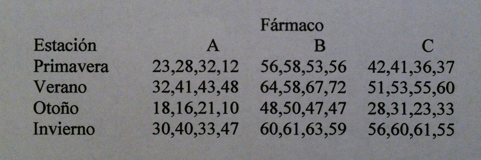 4) El asma bronquial es una enfermedad alérgica cuya virulencia depende de la estación. Se desean comparar tres fármacos antihistamínicos A, B, C en las cuatro estaciones del año. Se toma una muestra de 48 personas con asma crónico de intensidad análoga, que se divide en 12 grupos, uno para cada fármaco y estación, a razón de 4 enfermos por grupo. Los resultados se evaluaron en una escala objetiva que iba de 0 a 100 y fueron los siguientes: