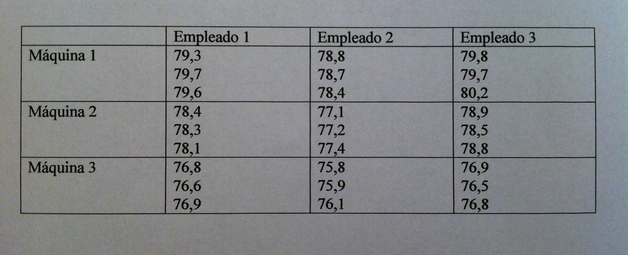5) En una planta de producción trabajan 50 empleados y hay 25 máquinas. Existen dos turnos de trabajo. Es muy importante la rapidez en la que se elaboran unas piezas. Se quiere valorar si existe diferencia en el tiempo de producción según empleado, según máquina y, también, se quiere saber si los empleados trabajan más o menos rápido según la máquina con la que trabajen. Se eligen tres empleados al azar y tres máquinas también al azar. Se mide el tiempo, en segundos, que tardan en elaborar tres piezas cada empleado en cada máquina. Los resultados son los siguientes: