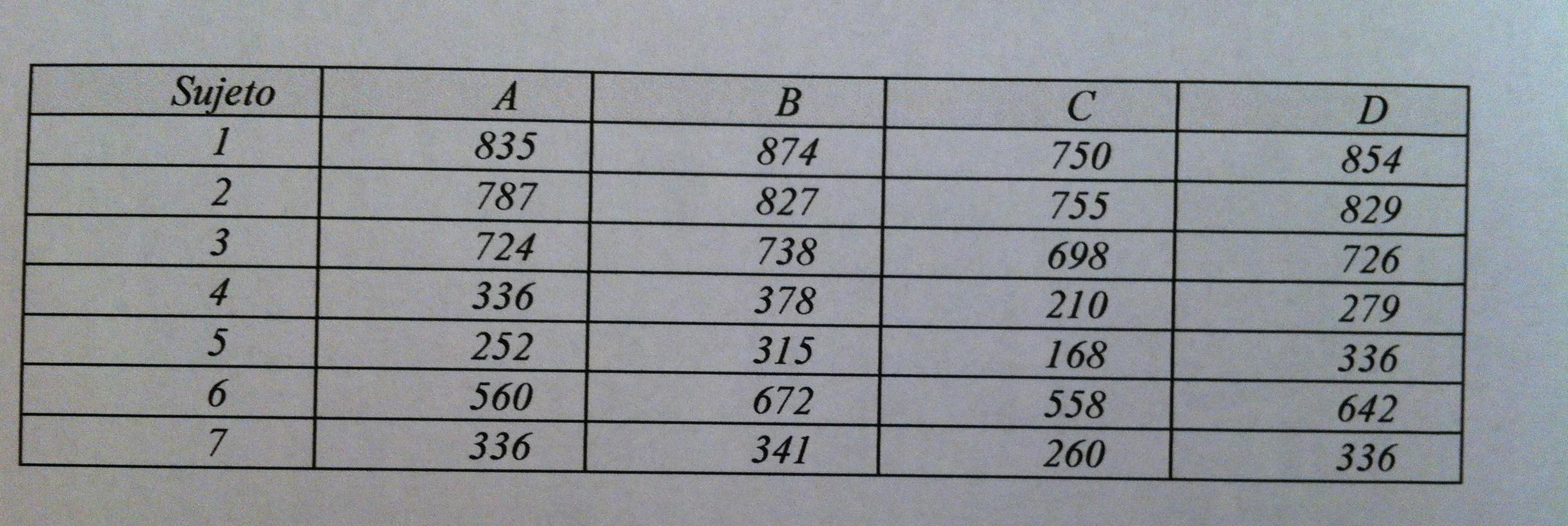 7) Los cigarrillos producen cantidades apreciables de monóxido de carbono. Cuando se inhala el humo del cigarrillo, el monóxido de carbono se combina con la hemoglobina para formar carboxihemoglobina. En un estudio reciente ( Carbon monoxide and exercise tolerance in chronic bronchitis and emphysema, Brit.Med.J. 283(1981) 877-880, Calvery,M.A. y otros) los investigadores deseaban determinar si una concentración apreciable de carboxihemoglobina reduce la tolerancia al ejercicio en aquellos pacientes que sufren de bronquitis crónica y enfisema. Se seleccionaron 7 pacientes y en un ambiente controlado, se les pidió que caminaran durante 12 minutos respirando cada una de las siguientes combinaciones gaseosas: aire, oxígeno,aire más monóxido de carbono y oxígeno más monóxido de carbono (respectivamente A,B,C,D). La cantidad de monóxido de carbono respirado fue suficiente para elevar la concentración de carboxihemoglobina de cada sujeto en 9%. Para controlar el consumo de monóxido de carbono, se pidió a los siete fumadores que dejaran de fumar 12 horas antes del experimento. Los datos representan las distancias caminadas por los sujetos (en m.) en los 12 minutos para cada condición experimental.