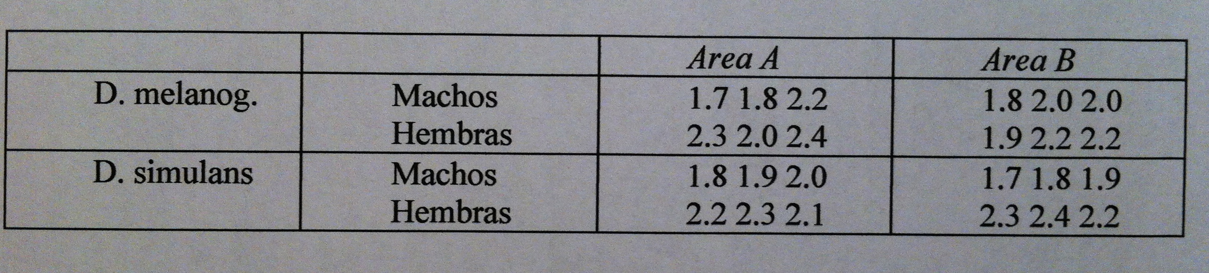 8) Se ha medido la longitud del ala en dos especies de Drosophilla : melanogaster y simulans, mantenidas en condiciones de laboratorio. Las mediciones se hicieron en poblaciones capturadas en dos áreas de interés especial Los resultados fueron los siguientes :