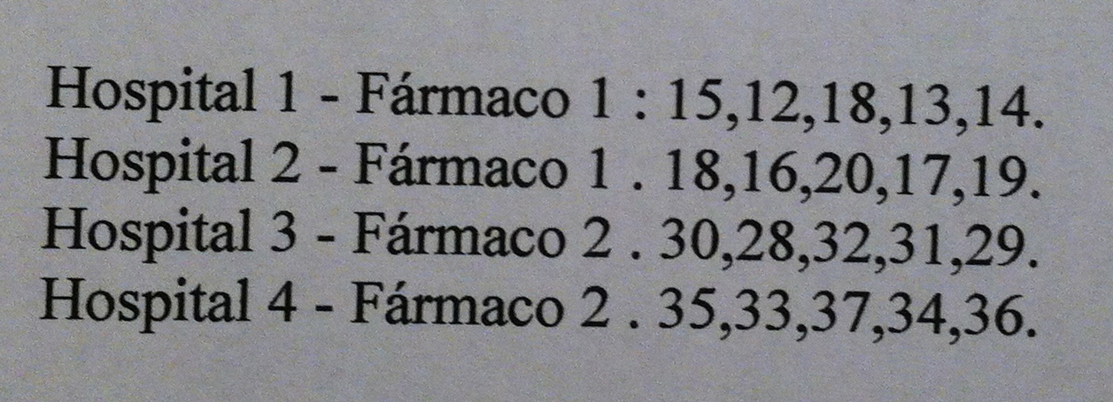 9) Se desea comparar el efecto de dos fármacos antidepresivos concretos. Se eligen 4 hospitales concretos que también nos interesa comparar. Cada hospital ensaya sólo un fármaco. Dentro de cada hospital se eligen 5 pacientes al azar. Se mide el grado de efectividad del fármaco de acuerdo a una variable que recoge la mejoría del estado después de la administración del fármaco. Se considera normalidad para la variable observada y homocedasticidad. Los datos obtenidos son: