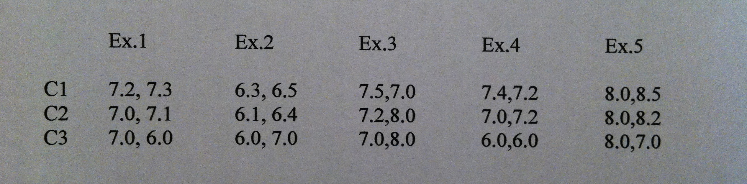 10) Se toman 15 exámenes al azar de una misma materia de las PAAU y se eligen, también al azar, 3 correctores. Estos 15 exámenes se dividen al azar en tres grupos de 5. De cada uno de estos exámenes se hace una copia. Después, cada grupo de cinco exámenes, con sus copias, se mezcla junto con 200 exámenes más que tiene que corregir cada corrector, de modo que cada corrector habrá corregido dos veces cada uno de los cinco exámenes seleccionados al azar para él, sin saberlo, evidentemente. Las notas que los profesores han proporcionado de los 15 exámenes seleccionados han sido las siguientes:
