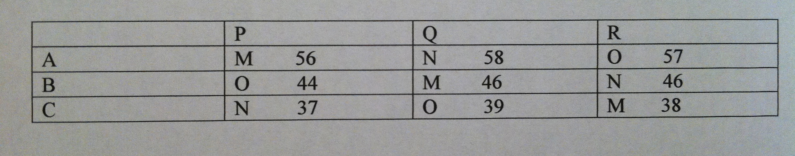 12) Se ensayan tres tipos de motor de coche (A, B, C), con tres tipos de ruedas (P, Q, R) y con tres tipos de asfalto (M, N, O) para ver qué factor tiene una mayor influencia en el consumo de un tipo de gasolina durante 100 km a una velocidad constante. Para ello si diseña un experimento en cuadrados latinos y se obtienen los siguientes resultados: