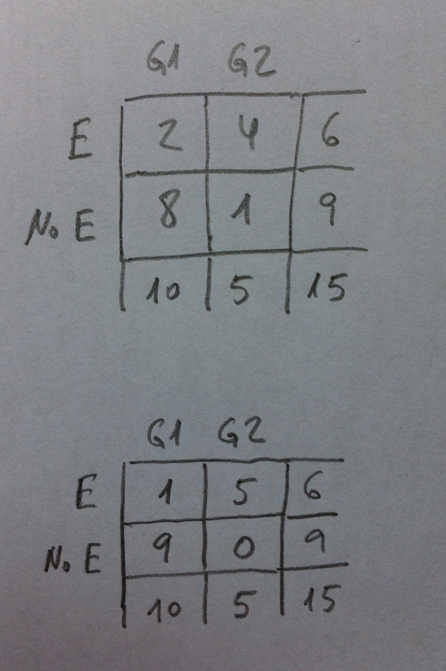 Supongamos el siguiente problema: Estamos comparando dos grupos de individuos y mirando cuántos, en cada grupo, tienen una determinada enfermedad y cuántos no la tienen. Y supongamos que tenemos los siguientes datos: