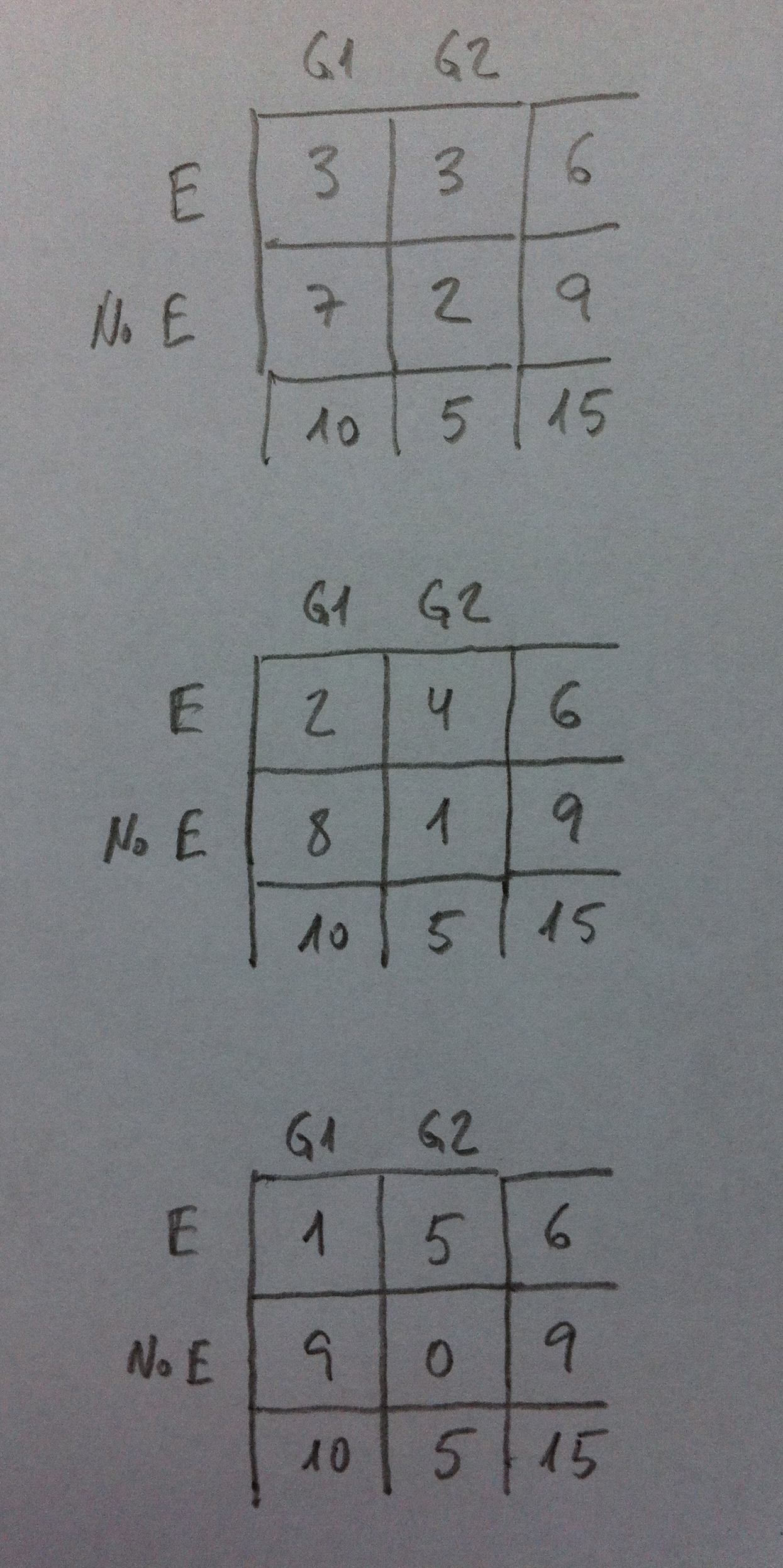 Ahora las tablas posibles más extremas que la vista, y que respetaran las sumas por filas y por columnas, serían las siguientes: