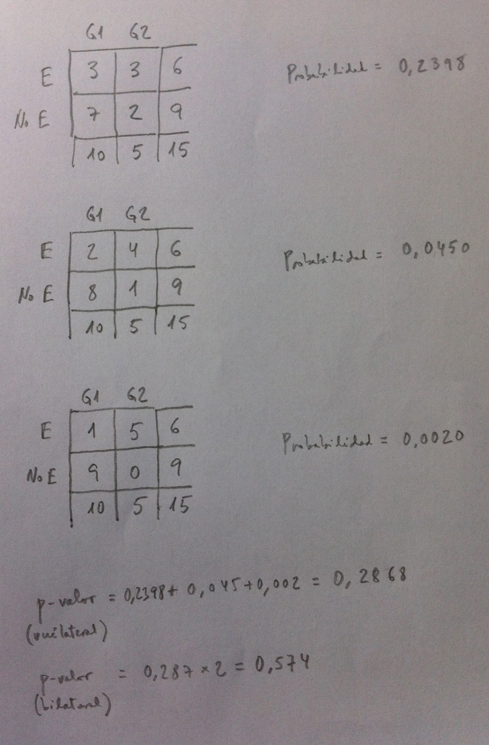 Si es un Test bilateral; o sea, que contrastamos igualdad de porcentajes versus diferencia, o no relación versus relación, multiplicaremos por dos esa suma de probabilidades para tener el p-valor. Si el Test es unilateral; o sea, que estamos contrastando igualdad versus menor o versus mayor, o estamos contrastando no relación versus relación en un sentido determinado (con una Odds ratio menor o una Odds ratio mayor que 1, pero únicamente uno de los dos lados), el p-valor será sólo el de la suma de las probabilidades de las tablas extremas construidas, siempre, claro, hacia el lado donde tiene más peso la Hipótesis alternativa.