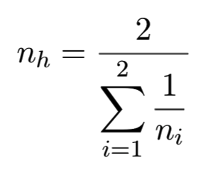 Observemos que el test está diseñado para el mismo tamaño muestral por nivel, por esto aparece esta n común. Si tenemos tamaños muestrales distintos se toma entonces como n la media armónica de esas medias. La media armónica de dos medias es la siguiente: