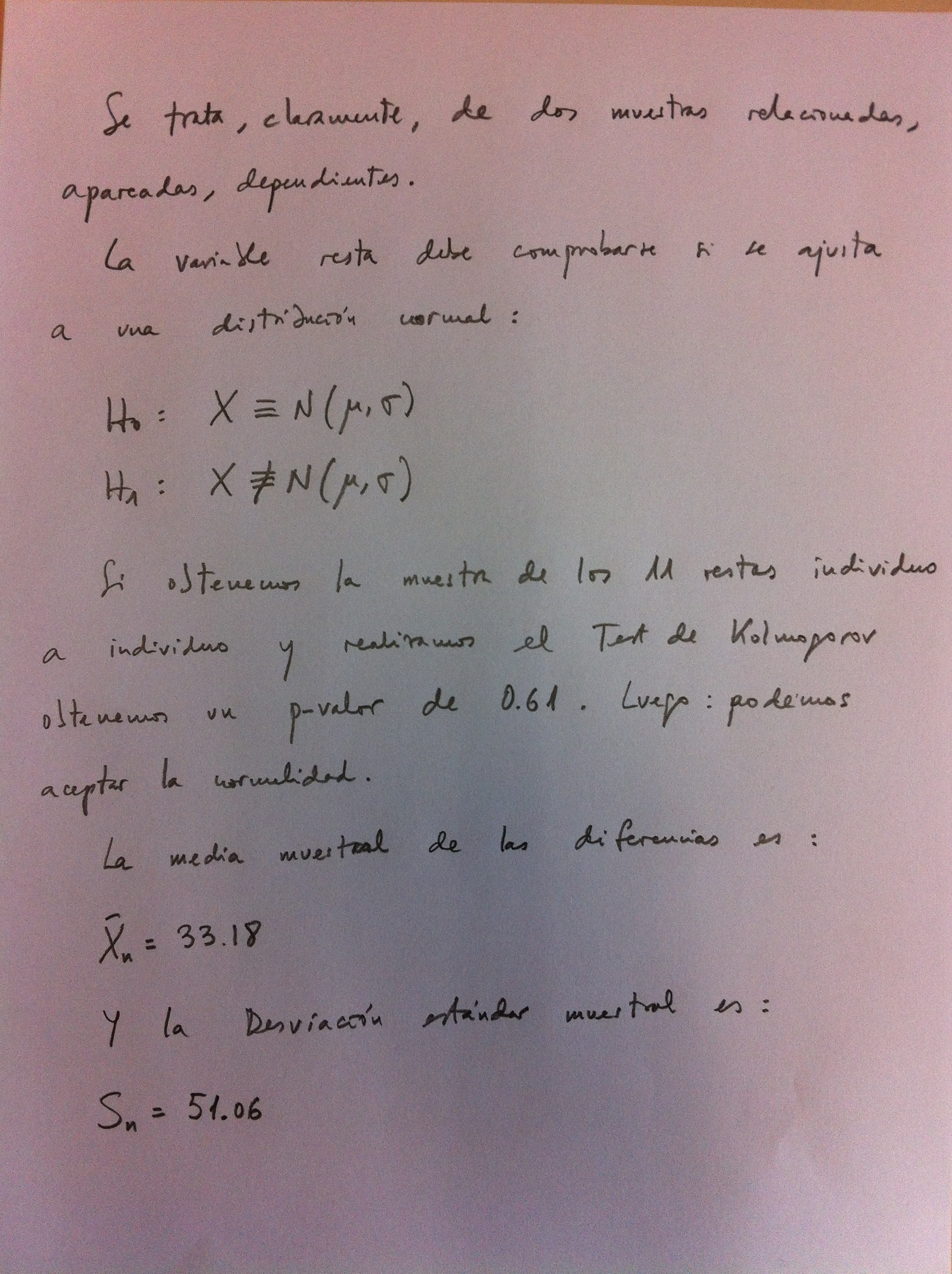 Se ha realizado un estudio para ver el efecto del ejercicio físico sobre el nivel de colesterol en sangre. Han participado 11 individuos en el estudio. Se analizó el nivel de colesterol de cada uno de ellos antes y después de ser sometidos, durante un tiempo, a un reglado proceso de ejercicios físicos.