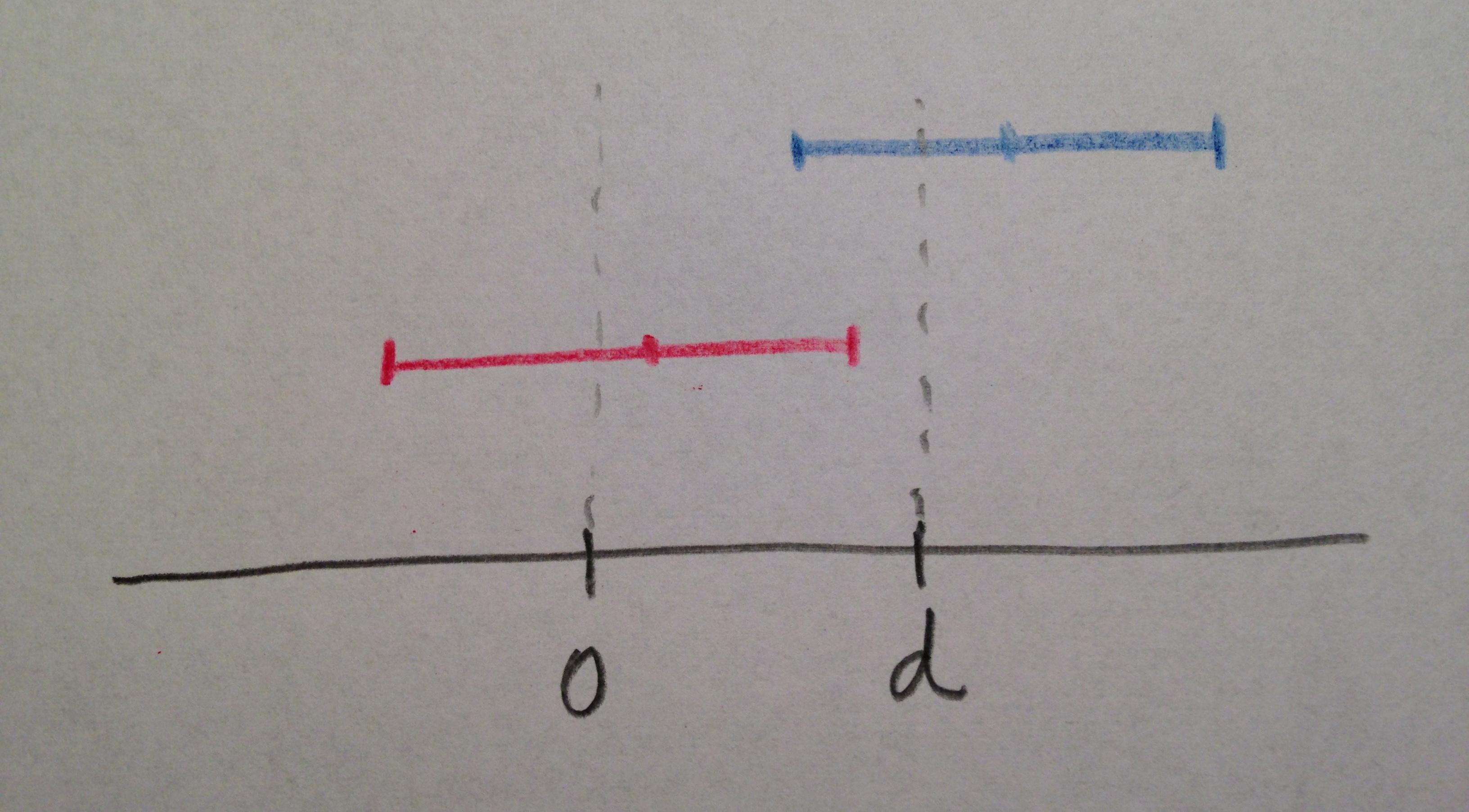 El contraste se suele realizar, en estos casos, evaluando intervalos de confianza. Esto es algo característico de este tipo de Test. Veamos, en ambos casos, qué posición ocuparía un intervalo de confianza para mantener la Hipótesis nula (ejemplo en azul) o para rechazarla y aceptar, entonces, la Hipótesis alternativa (ejemplo en rojo):