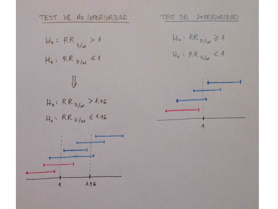 A la izquierda vemos la formulación de lo que sería a priori el test de no inferioridad y a la derecha vemos lo que sería el test de superioridad. De facto, planteado de la primera forma, el test de inferioridad se transforma, de facto, en un test de superioridad, por lo tanto, se transforma en un test muy exigente, un test que exige que cualquier intervalo de confianza excluya al 1.