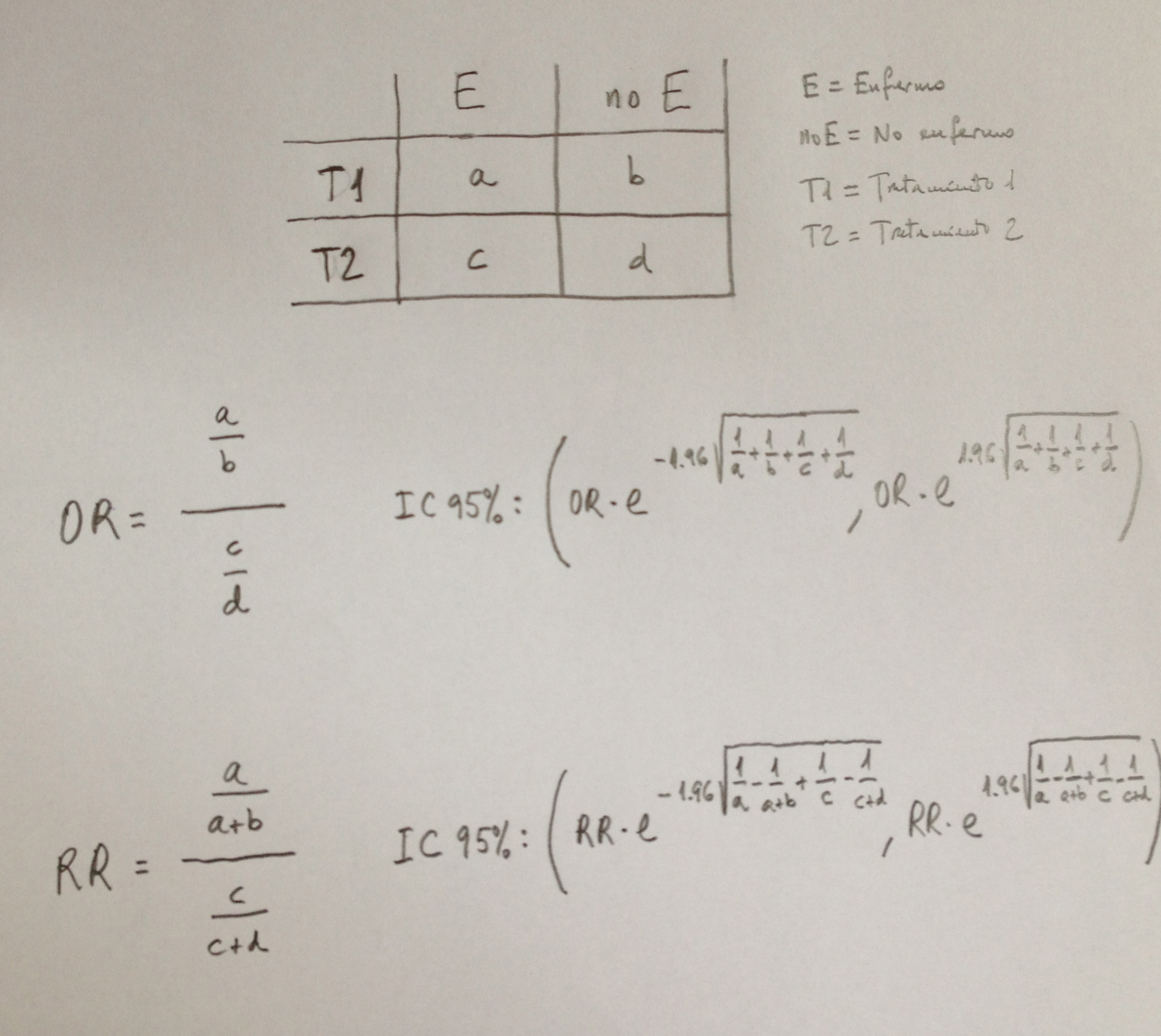 La Odds ratio, el Riesgo relativo y sus intervalos de confianza Deja un comentario Veamos el cálculo de estos dos importantes estimadores de asociación en Medicina: la Odds ratio y el Riesgo relativo. Con el cálculo de sus intervalos de confianza: Comparte esto: Haz clic para compartir en X (Se abre en una ventana nueva) X Haz clic para compartir en Facebook (Se abre en una ventana nueva) Facebook Me gusta Cargando...