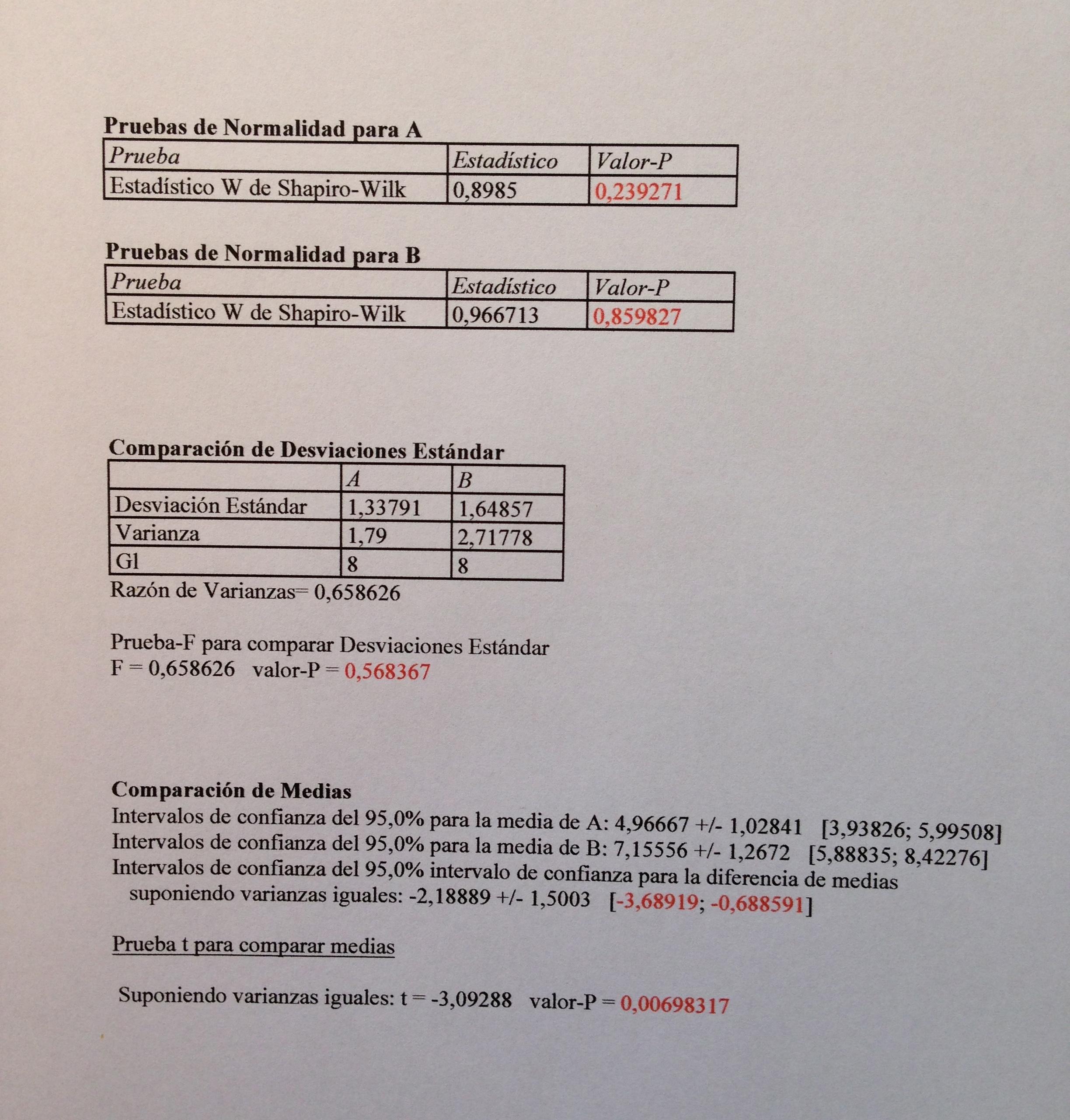 4. Variables continuas, ahora, muestras independientes. Hace falta comprobar si hay normalidad y si la hay (que la hay, en este caso) hace falta comprobar la igualdad o no de varianzas o de desiviaciones estándar. Si hay igualdad, como sucede, efectivamente, debe aplicarse el Test de la t de Student de muestras independientes y varianzas iguales. Todos estos pasos se exponen a continuación: