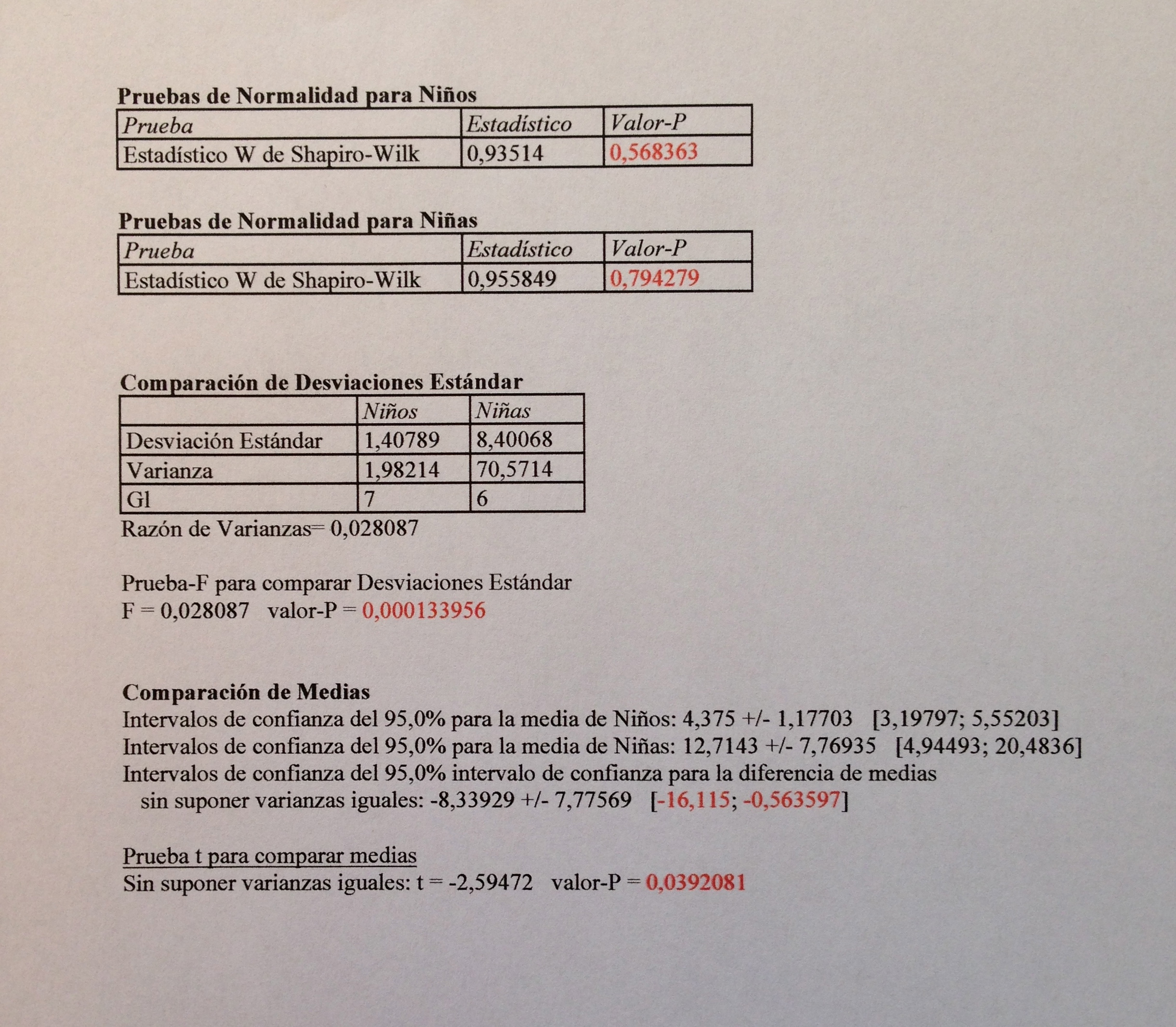 5. Variables continuas, muestras independientes. Hace falta comprobar si hay normalidad y si la hay (que la hay, en este caso) hace falta comprobar la igualdad o no de varianzas o de desviaciones estándar. Si no hay igualdad, que es lo que sucede en este caso, debe aplicarse el Test de la t de Student de muestras independientes y varianzas desiguales. Todos estos pasos se exponen a continuación: