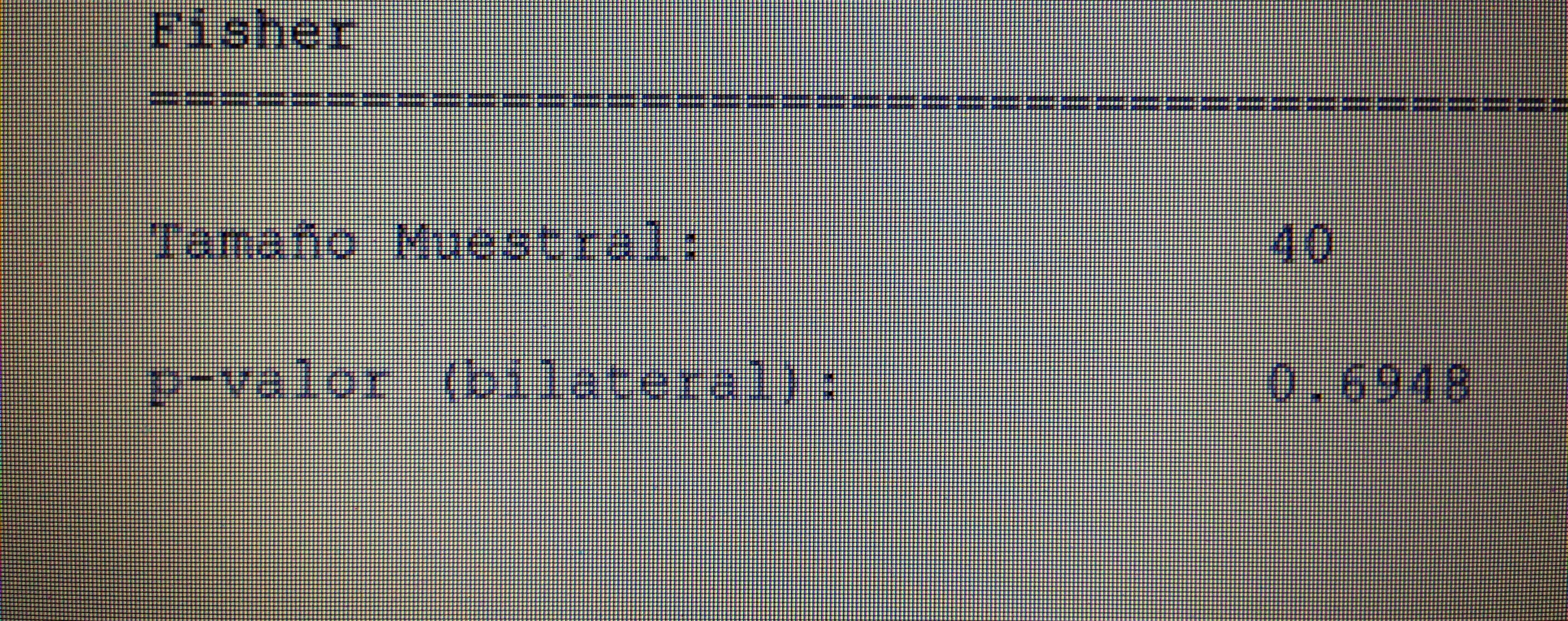 2. La variable es dicotómica y las muestras son independientes. Como el tamaño de muestra es inferior a 30 aquí conviene usar el Test exacto de Fisher. El resultado es el siguiente: