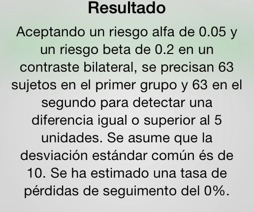 Nos dice que hemos de usar 63 pacientes por grupo que es lo que han hecho los que han planteado el estudio comentado. Esto significa que si la diferencia es mayor de 5 unidades del índice SF-36 lo detectaremos como estadísticamente significativo.