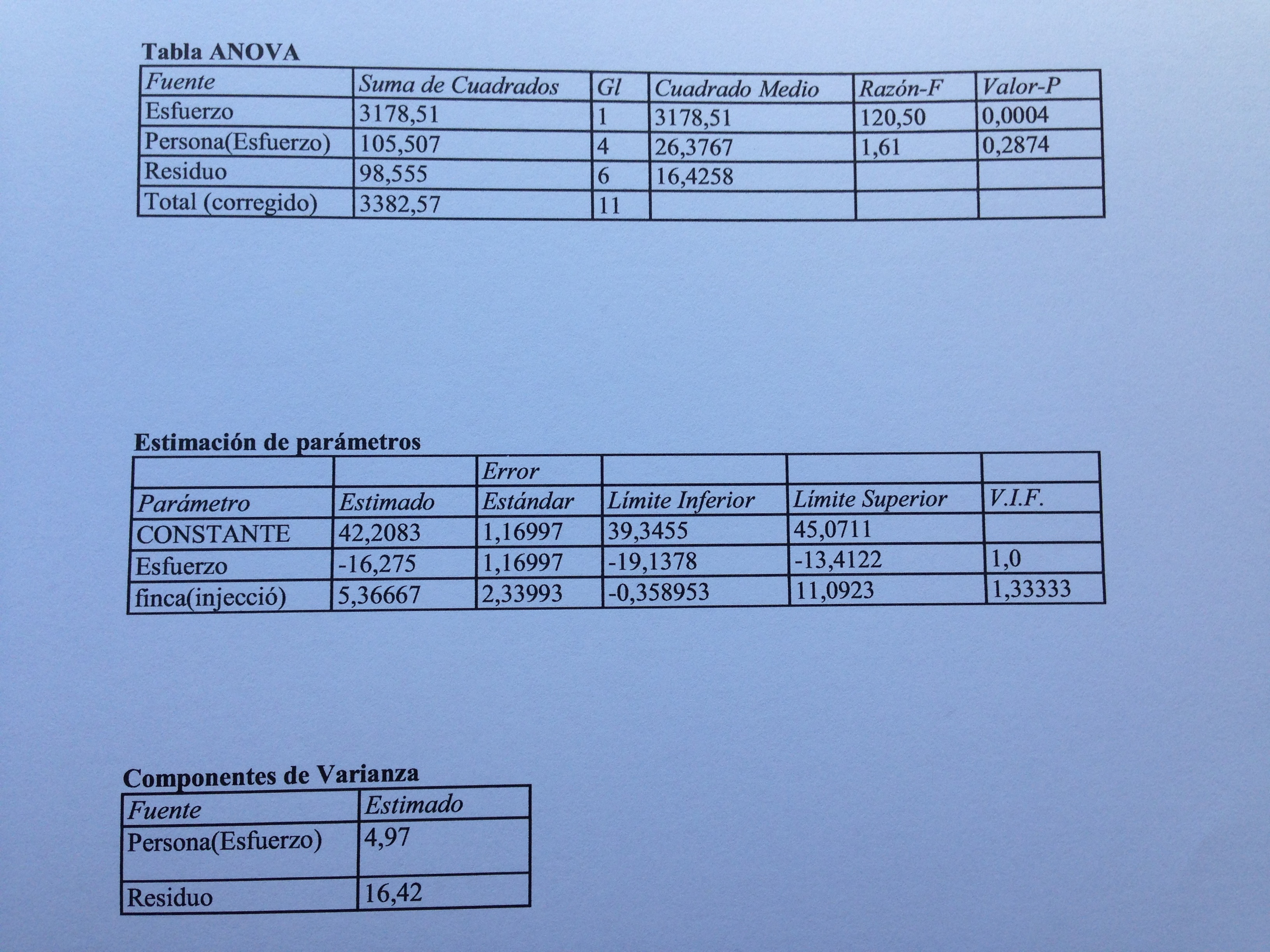 Viendo estos datos, viendo la tabla ANOVA, podemos decir que en esta variable tiene valor significativamente distintos según se haya o no hecho un esfuerzo. Vemos que no depende de las personas. A pesar, podríamos decir, también de que el residuo es bastante elevado. Pensemos que hay ocasiones donde distintas medidas presentan valores bastante distintos. Esto nos podría hacer pensar que posiblemente no estemos bajo las condiciones necesarias para aplicar el ANOVA. No hemos aplicado el test de Barlett ni el de Shapiro-Wilk.