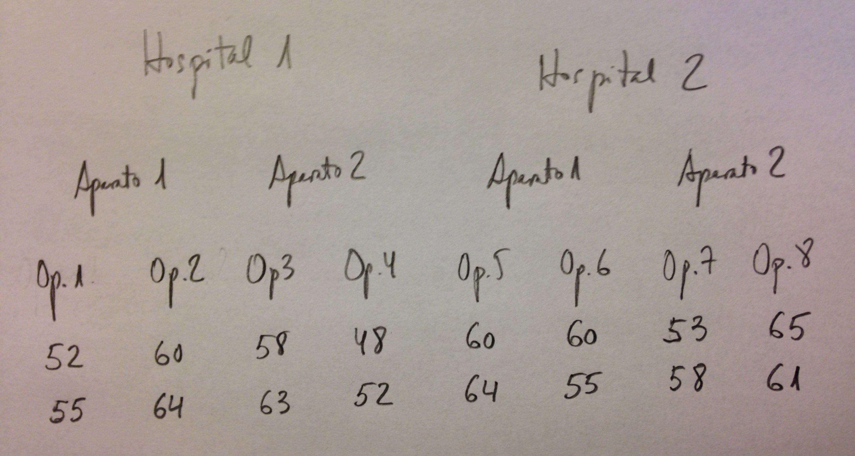 Se diseña un ensayo con dos tratamientos desinfectantes que se quieren comparar. Cada uno de ellos consiste en un mecanismo cuya puesta en práctica requiere una dimensión manual en la que se cree que el operario que lo lleva a la práctica condiciona mucho el resultado. Y se quiere comprobar, también, mediante este diseño. En el ensayo se ha trabajado en dos hospitales distintos (Uno de tercer y otro de segundo nivel). Para cada método y para cada hospital se eligen dos operarios diferentes que son personal trabajador de ese hospital. En total, pues, ocho operarios: cuatro operarios por hospital.