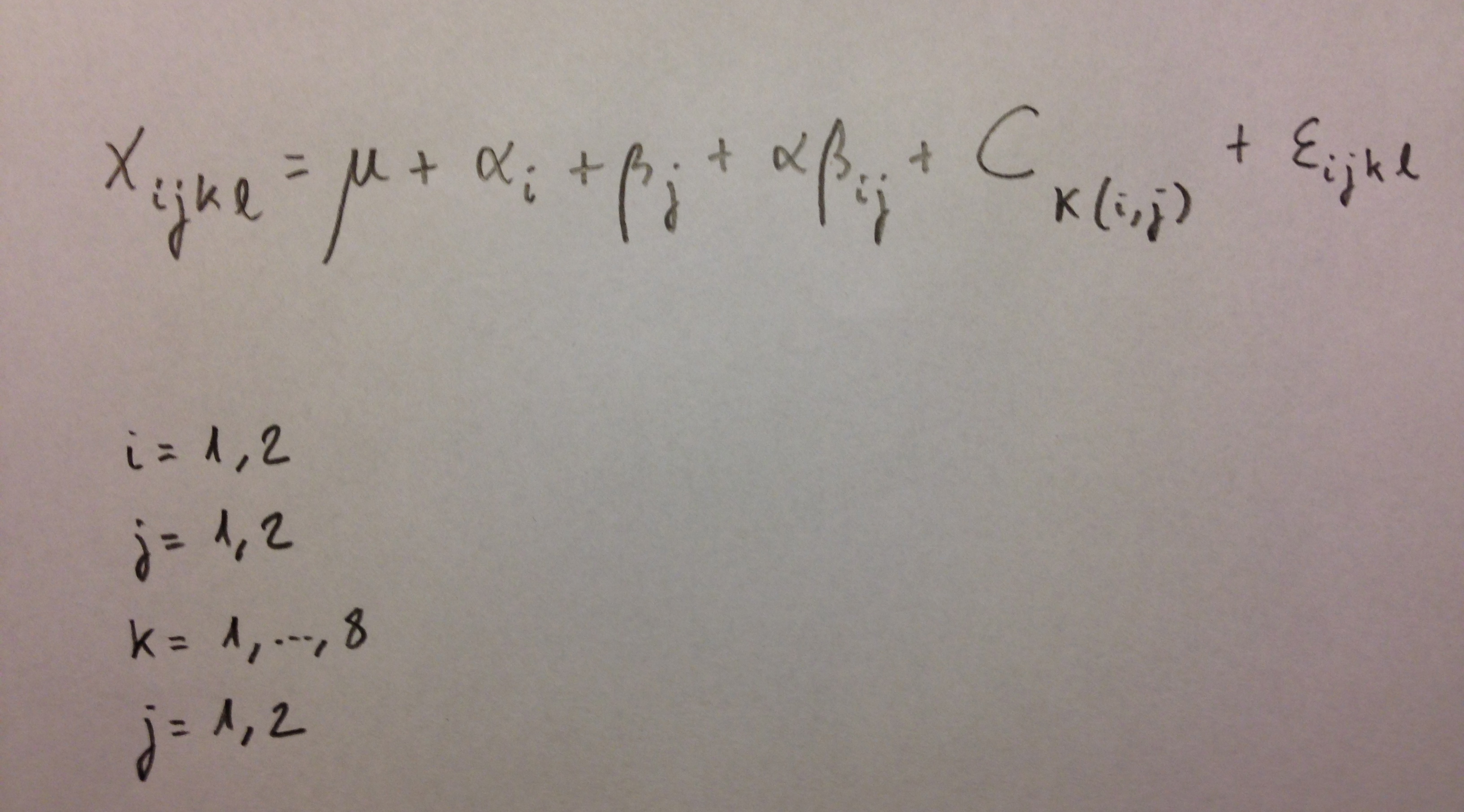 En la tabla ANOVA puede comprobarse cuáles son los cocientes de los cuadrados medios. Para verificar que son los adecuados es recomendable ver el resultado de aplicar el algoritmo de Bennet-Franklin de este modelo. Puede verse en este enlace el algoritmo aplicado a este modelo concreto.