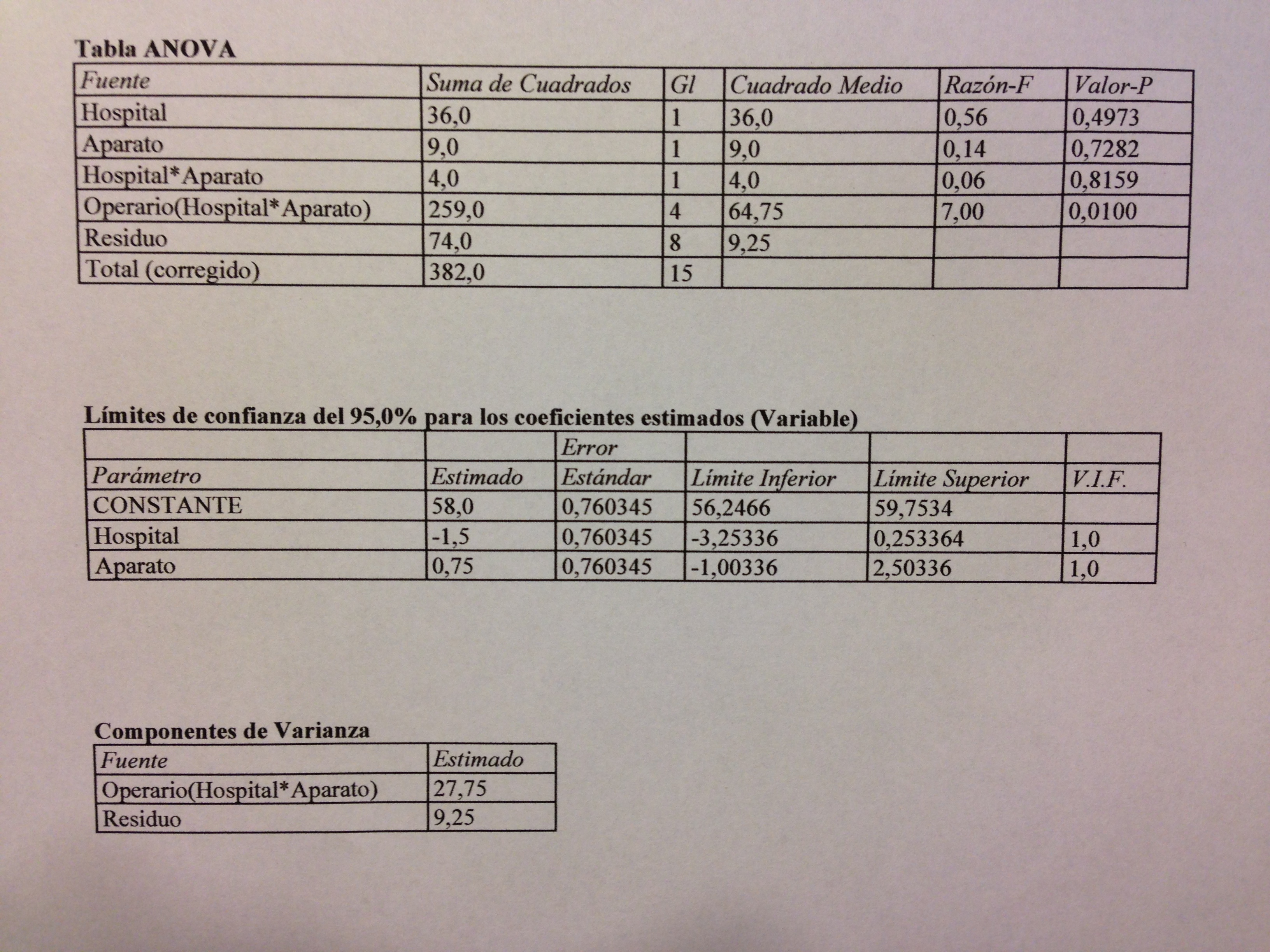 El modelo es de tres factores. Dos fijos y cruzados (Hospital y Aparato) y un tercero aleatorio y anidado en la interacción de los otros dos.