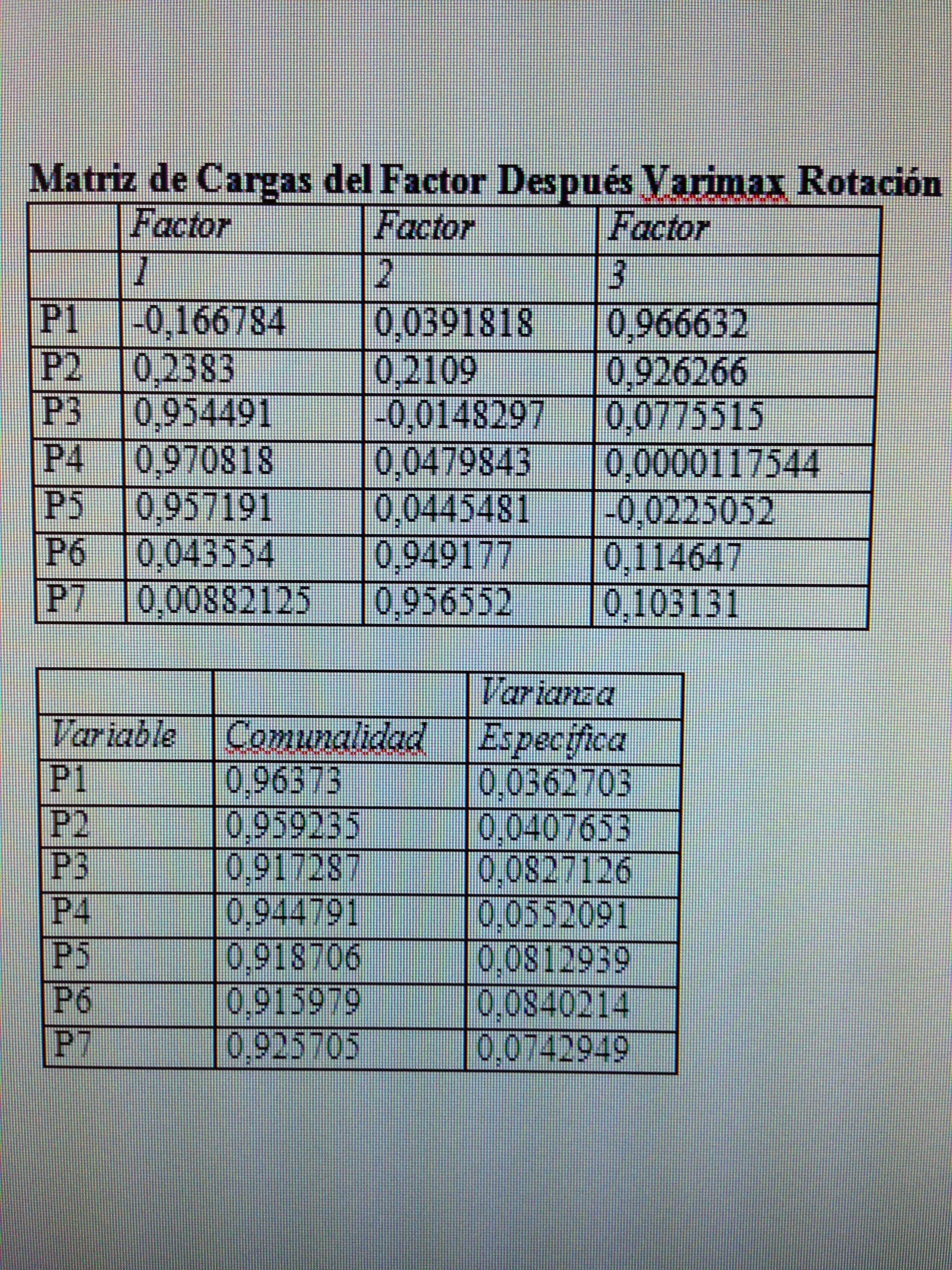 Con la rotación variamax conseguimos realmente tres factores claramente delimitados. Observemos que en el primer factor las variables con peso son la P3, P4 y P5. En el segundo son P6 y P7. En el tercer factor son P1 y P2 las que tienen el protagonismo. Esto cuadra con lo que hemos visto al analizar las correlaciones en el fichero 3 de esta serie.