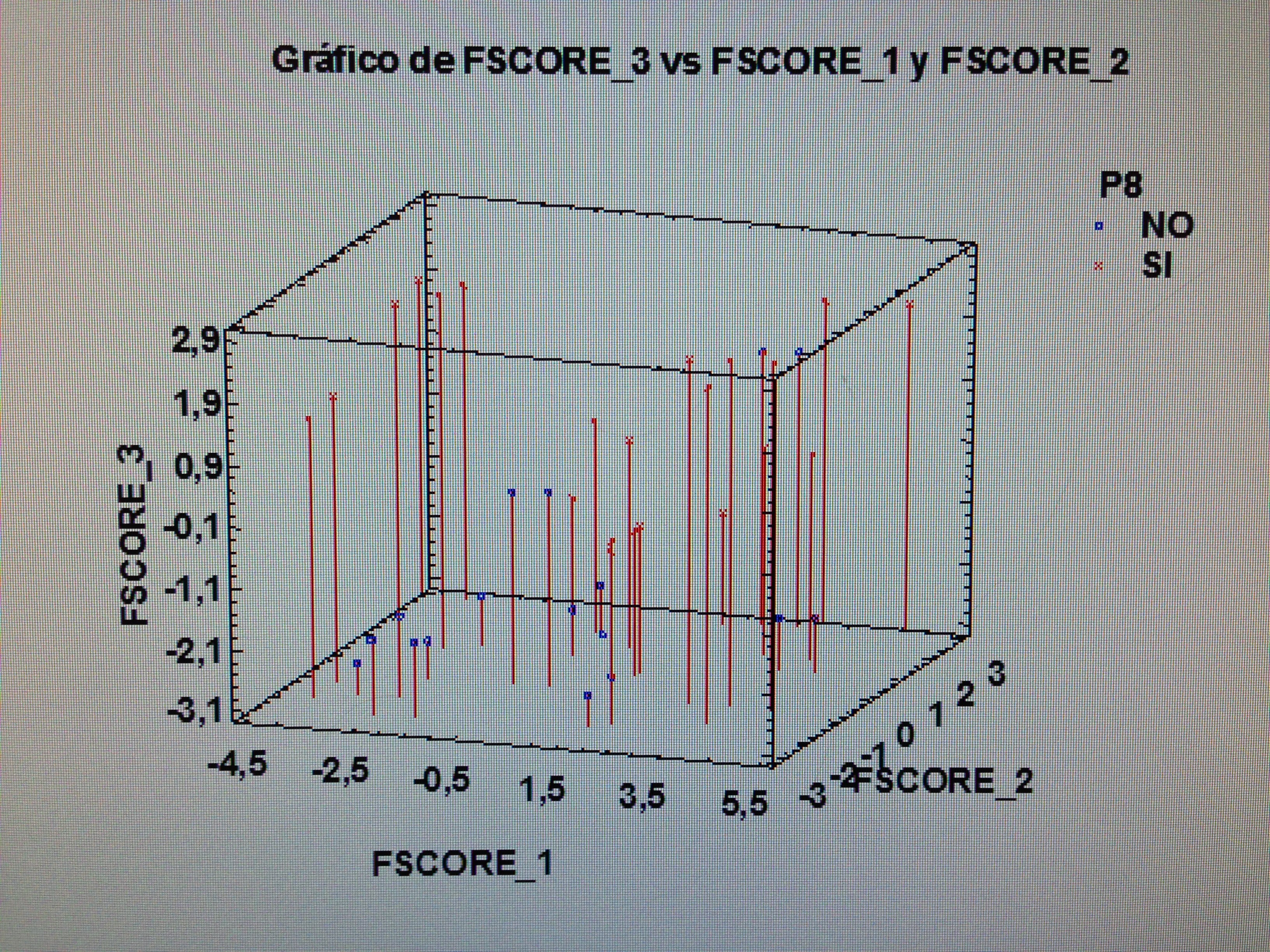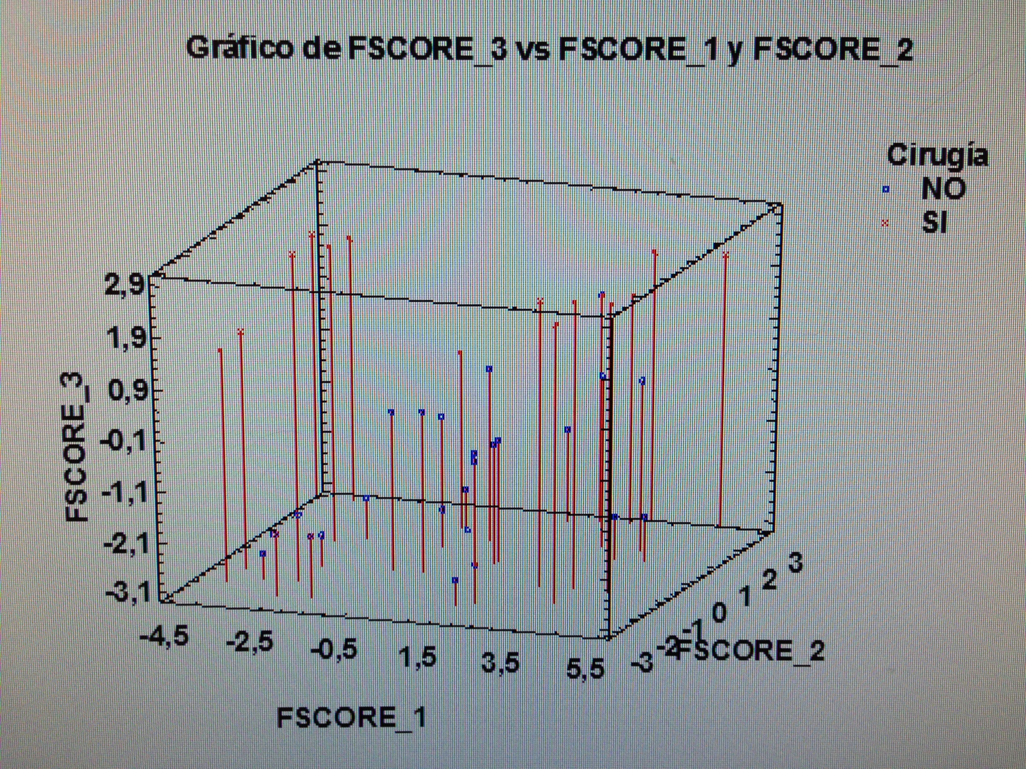 Observemos que los pacientes que consideran su problema resuelto tienen mucho de todos los factores, pero hay un grupo que tienen valor bajo del primer factor, pero nunca de los otros dos. Los que consideran que su problema no ha quedado resuelto estos están mayoritariamente próximo al vértice donde los tres factores tienen valores bajos.