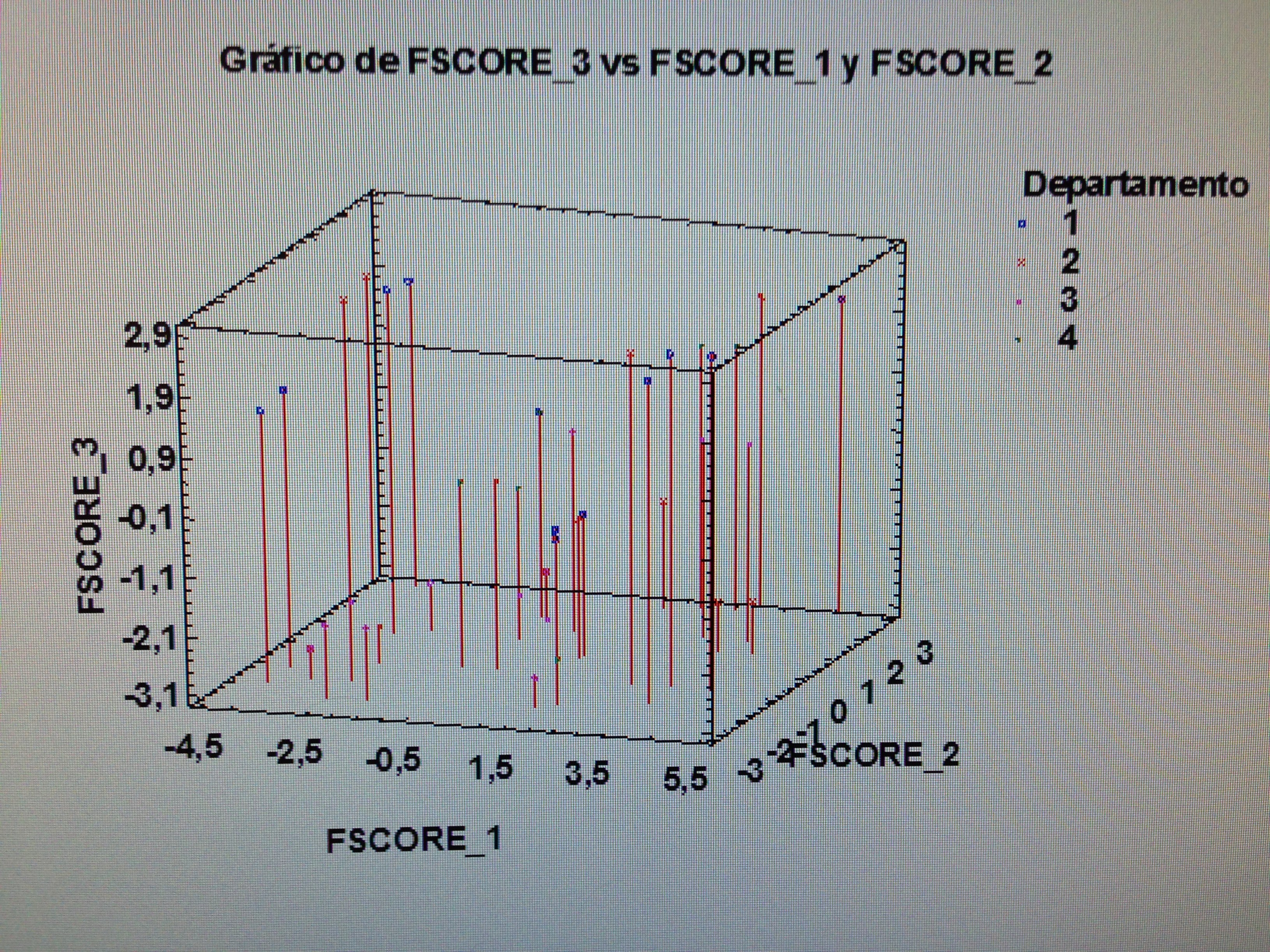 Si se observa con detalle el gráfico puede apreciarse que el departamento 3, que es Urología, es el departamento que tiene valoraciones más bajas. Sus valores están preferentemente en el extremo de los valores bajos de los tres factores.