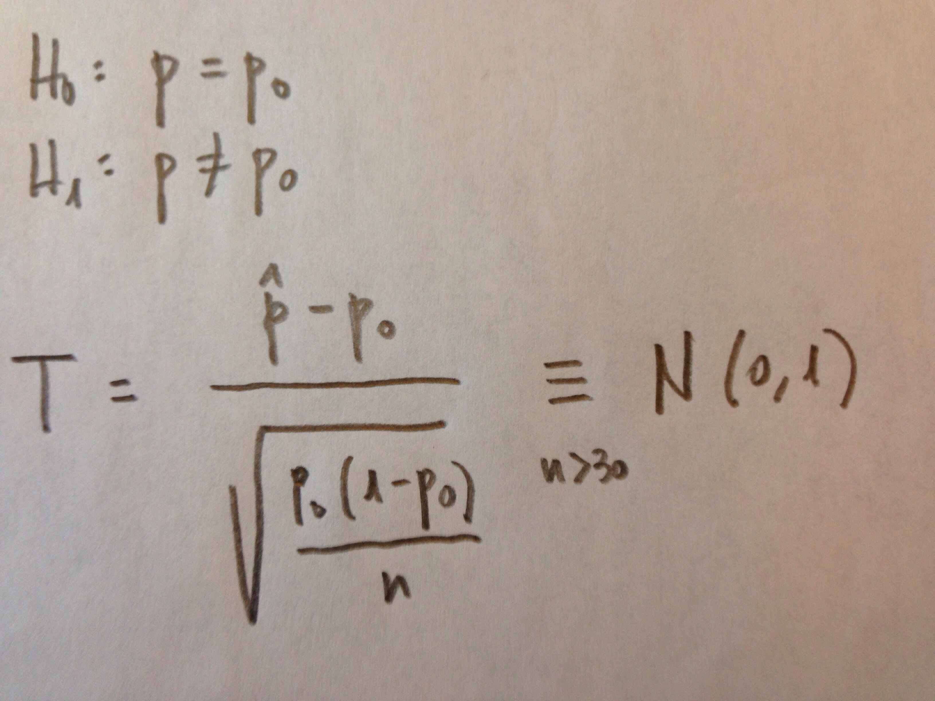 Veamos el siguiente ejemplo: Supongamos que queremos comprobar si una moneda tiene un desequilibrio. Aplicaríamos este contraste con po =0.5. Por lo tanto, la Hipótesis nula afirma que p=0.5. Supongamos que en un muestreo de 100 lanzamientos de esa moneda han salido 65 caras y 35 cruces. Si calculamos el valor del estadístico T es 3 ó -3 según miremos las caras o las cruces del muestreo. Como en una normal N(0, 1) la zona de rechazo de la hipótesis nula está a la derecha de 1.96 y a la izquierda de -1.96, para un nivel de significación del 0.05, podemos rechazar tal hipótesis. El p-valor es menor que 0.05. Debemos rechazar la hipótesis de equilibrio.