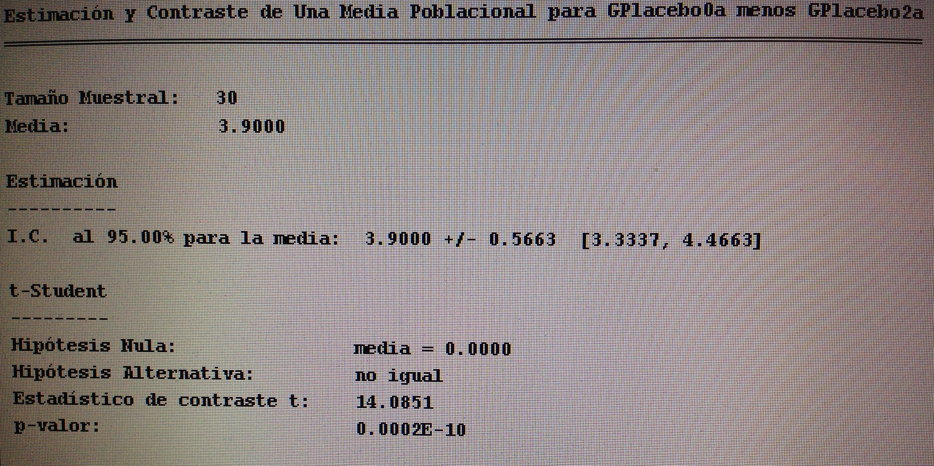 De nuevo variables continuas y muestras relacionadas. Debemos, pues, comprobar la normalidad de la variable Resta del grupo Placebo. El Test de Shapiro-Wilk, en este caso, nos da un p-valor de 0.0782, por lo tanto, como hay ajuste a la distribución normal, podemos aplicar el Test de la t de Student de datos apareados para evaluar si hay diferencias estadísticamente significativas. La salida de ordenador es la siguiente: