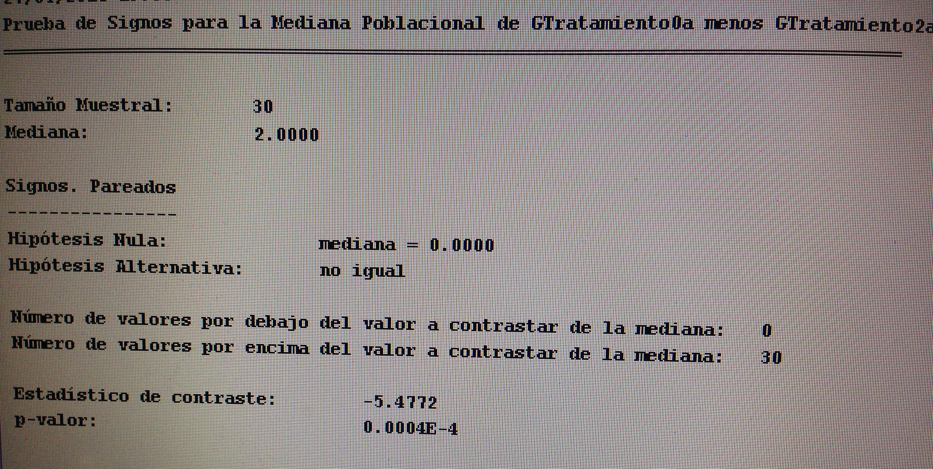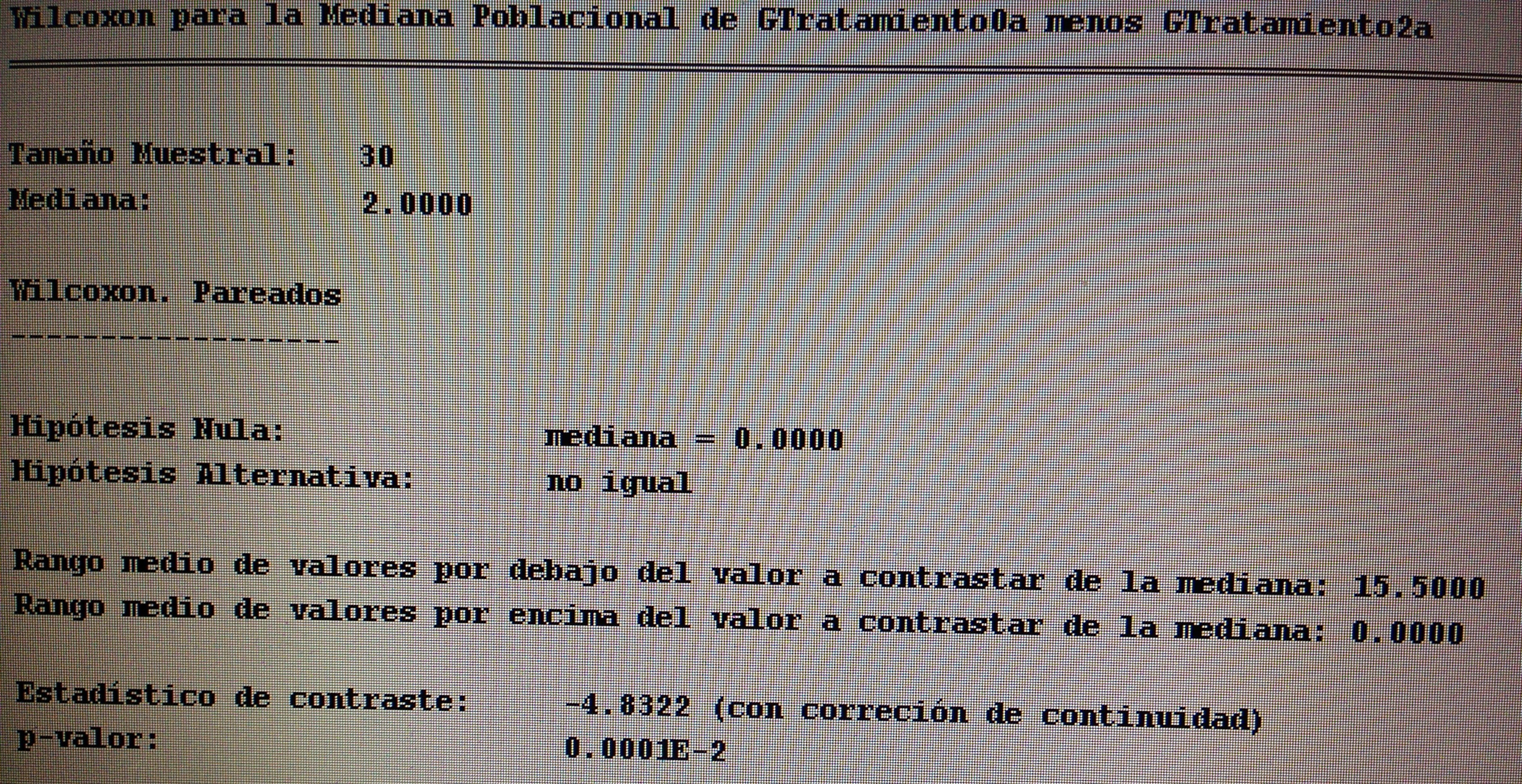 De nuevo variables continuas pero ahora muestras relacionadas. Debemos, pues, comprobar la normalidad de la variable Resta del grupo Tratamiento. El Test de Shapiro-Wilk, en este caso, nos da un p-valor de 0.0008, por lo tanto, como no hay ajuste a la distribución normal, debemos aplicar o el Test de Wilcoxon o el Test de los signos para evaluar si hay diferencias estadísticamente significativas. La salida de ordenador del Test de Wilcoxon es la siguiente:
