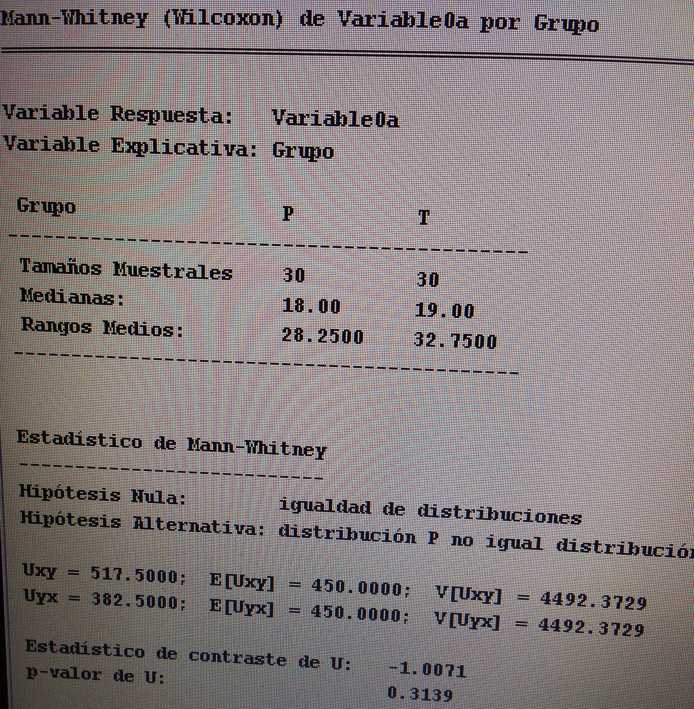 No hay diferencias entre las medianas (p=0.3139). Aunque tengamos una mediana de 18 y otra de 19 estas diferencias no son estadísticamente significativas. Podemos, aceptar, pues, que estamos ante dos grupos homogéneos.