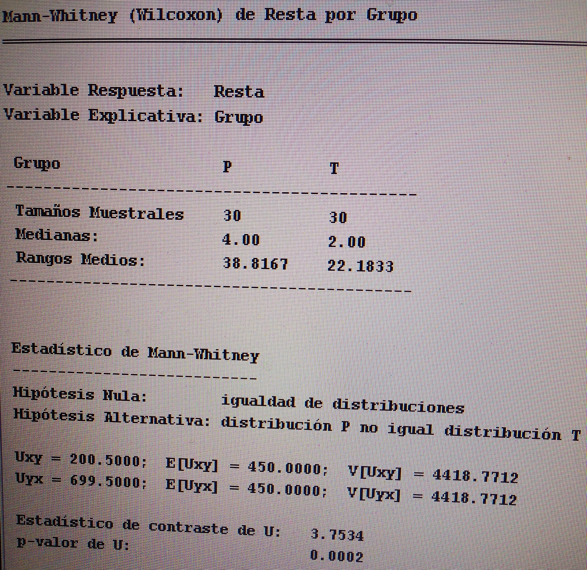 La variable Resta es continua, y, evidentemente, se trata de muestras independientes, hemos visto, en los apartados 2 y 3, que una no se ajusta a la distribución normal y la otra sí (p-valores del Test de Shapiro-Wilk de 0.0008 y de 0.0782, respectivamente). Esto nos obliga a trabajar con el Test de Mann-Whitney, cuya salida de ordenador, para estos datos, es la siguiente: