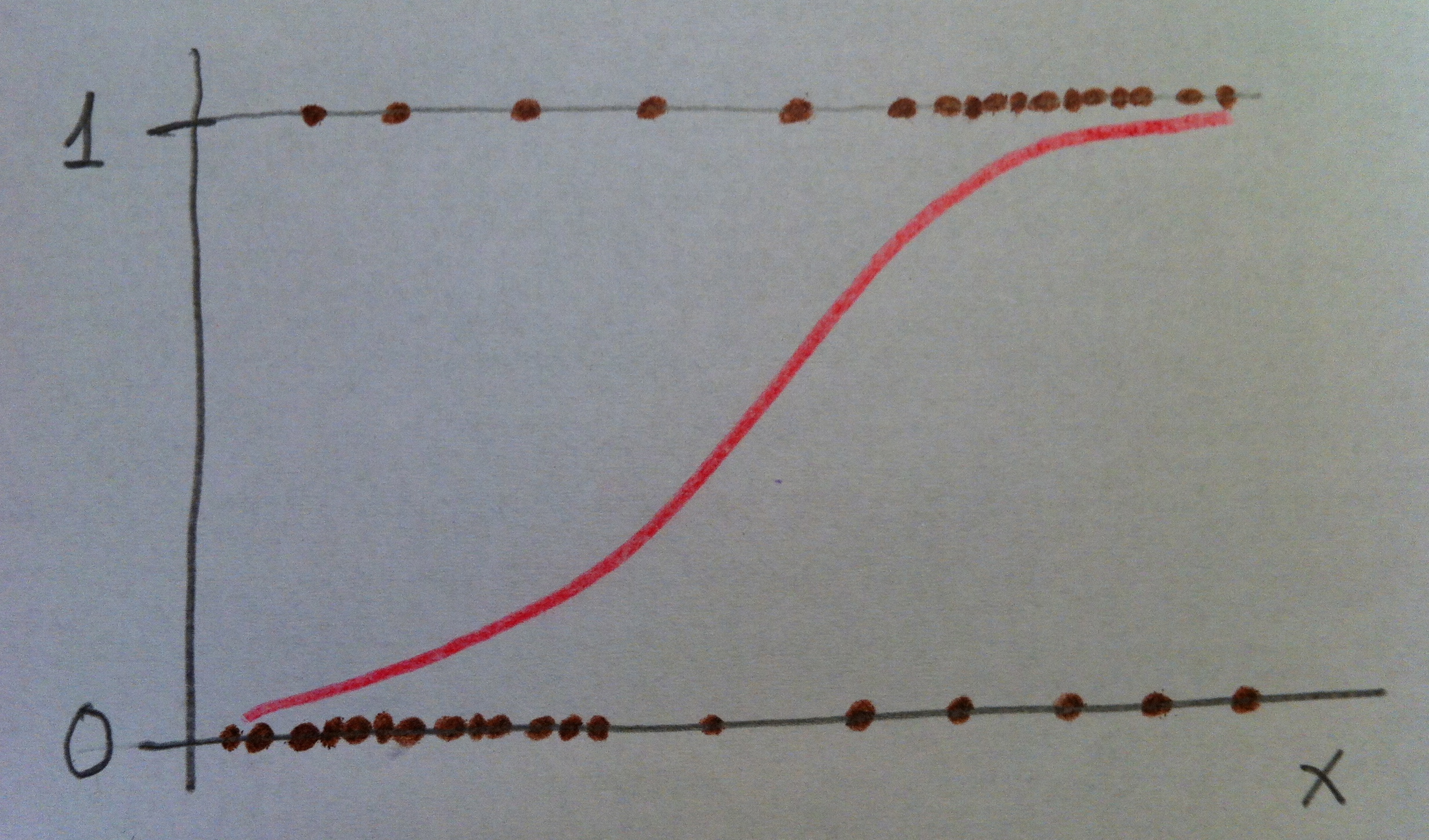 El modelo construye una curva que se adapte lo más fielmente posible a los datos, que en el dibujo anterior es la curva dibujada en color rojo. Para más detalles puede consultarse, en este blog, el Tema 11: Regresión logística.